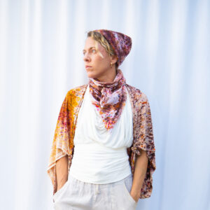 Style the Pomegranate Halter Scarf as a halter top, a wrap, or a dramatic scarf — the 40×40 inch square gives you room to invent.