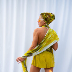 Style the Golden Halter Scarf as a halter top, a wrap, or a dramatic scarf — the 40×40 inch square gives you room to invent.