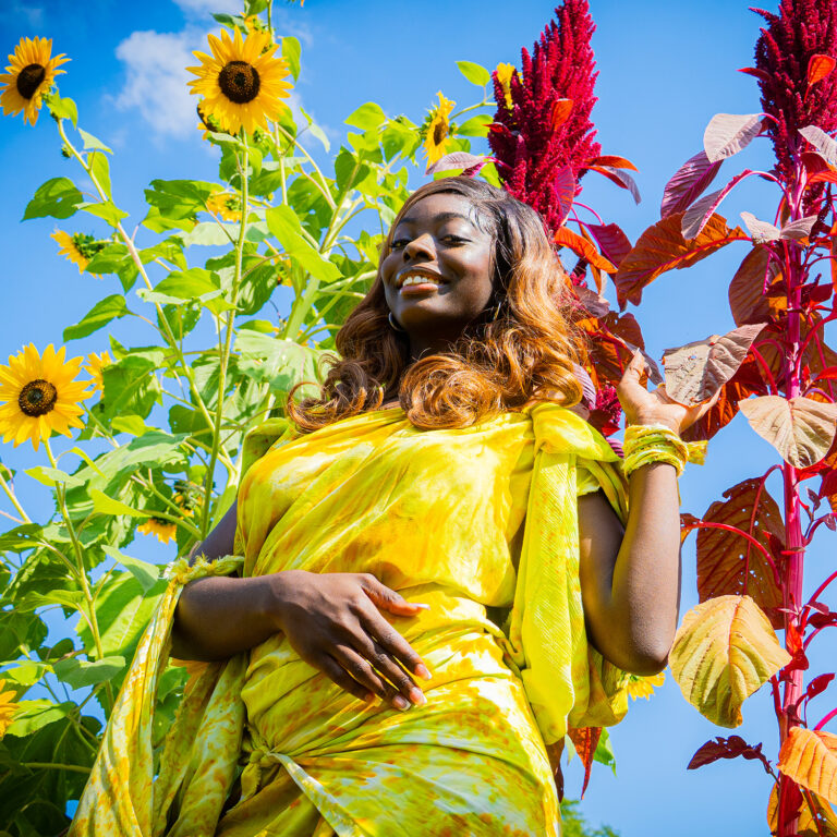 We stepped into Chartreuse at the Hillcrest Community Gardens. The sun was hot, school pickup lines buzzed nearby, and the garden felt like it was mid-laugh—vibrant and unruly. As Nessa wandered between sunflowers, tomatoes, and waist-high blooms, she carried herself like royalty. Regal, curious, present. She let her intuition guide the shoot, finding places she belonged like she’d grown there. When the light hit her skin, she shimmered like the underside of a leaf catching sunlight for the very first time.