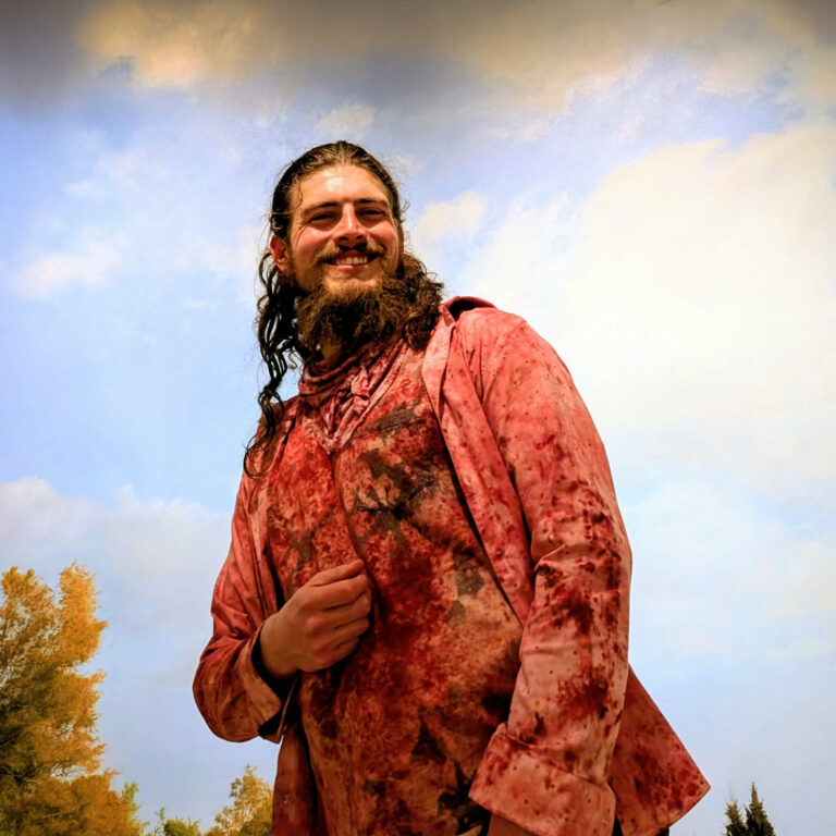 For this Power Portrait, Dustin didn’t arrive with a blank slate. He built his look from what he already owned: blue jeans, a gray t-shirt, and a patterned button-up. Instead of adding color first, we removed it. We bleached the pieces—opening space. Then we dusted Burgundy lightly into the quiet places. The result wasn’t loud. It was intentional – like motion captured in passing.