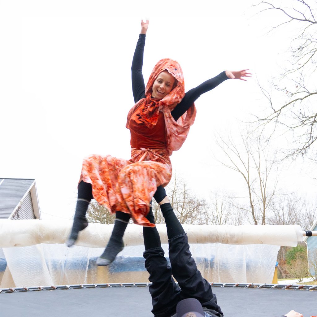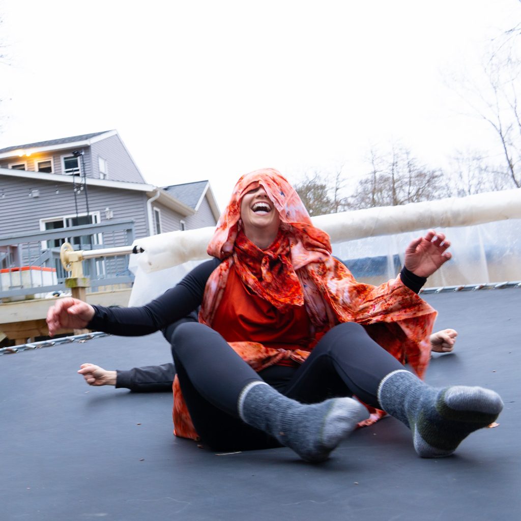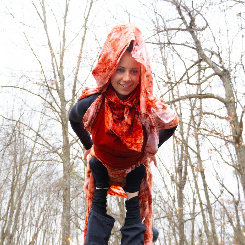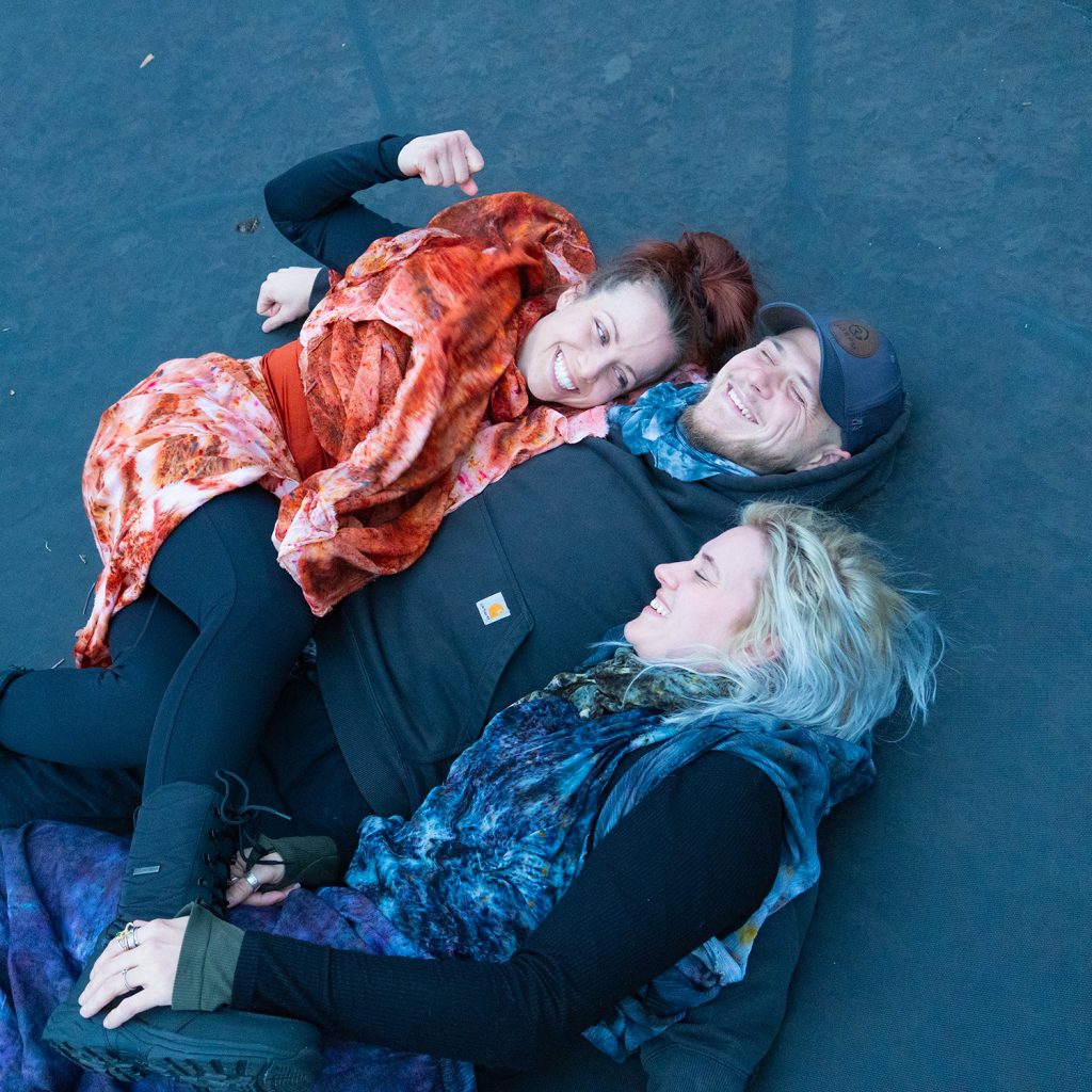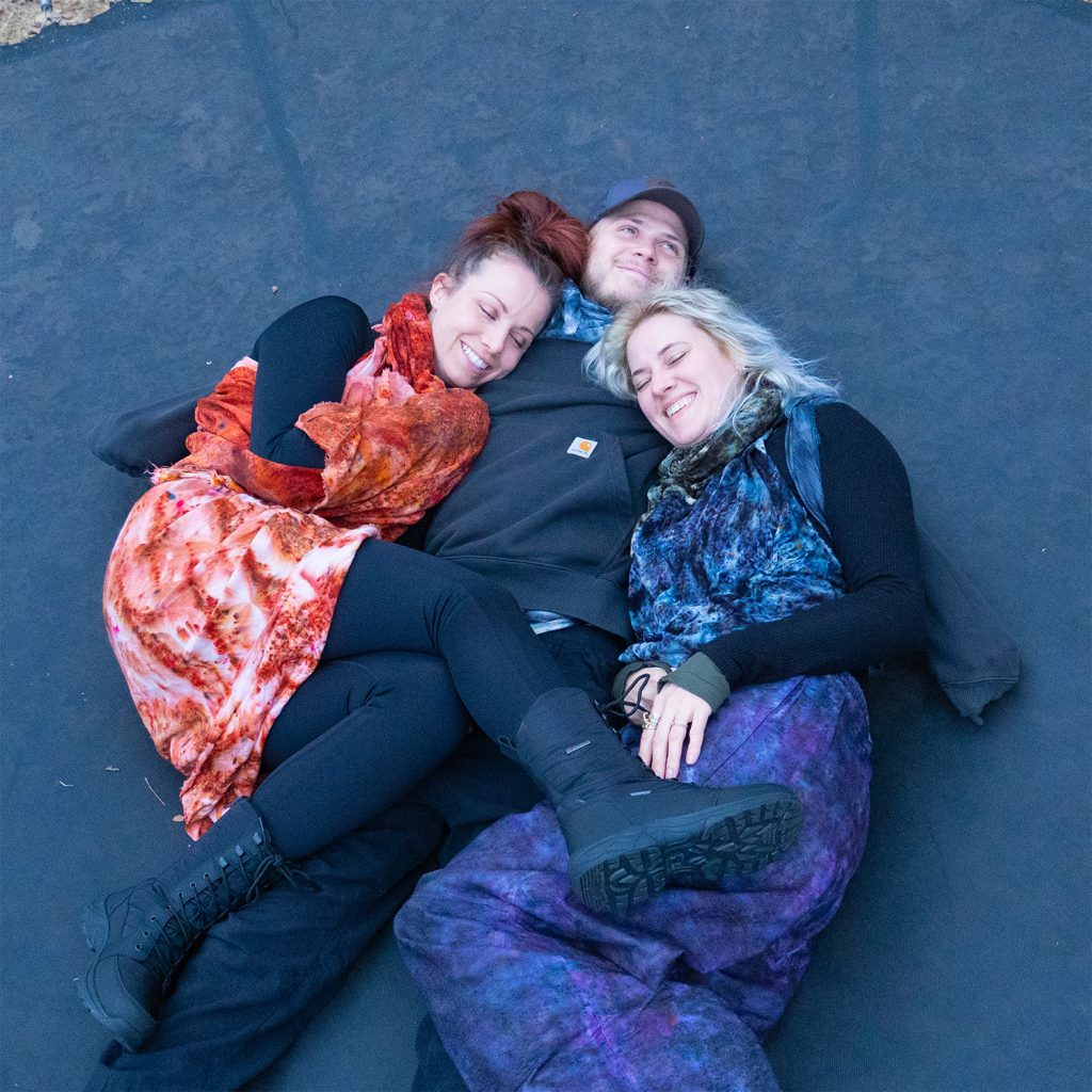Emmy arrived and reached for rust brown and terracotta — burnt reds that matched the planet itself. She didn’t just wear the colors. She became an extension of them. Her movement wasn’t choreographed. It was planetary. In flow with the wind, the earth beneath her, the heat from the fire behind her. Watching Emmy, Kami, and Johnny do acro yoga in the Cedar Springs back country, in their planetary layers, was one of the most beautiful things I have witnessed at any More ∞ Joy gathering.