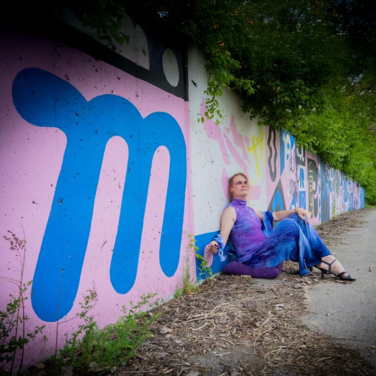 For her Power Portrait, Mika asked to be photographed in liminal places—where things mixed and merged: cement and water, sky and glass, steel and wildflower. In downtown Grand Rapids, she stood steady beside the river, fabric flowing around her, while the city stood fixed behind her. She moved with quiet intention, like a river slowly carving its path through stone.