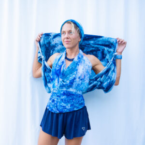 Style the Cobalt Halter Scarf as a halter top, a wrap, or a dramatic scarf — the 40×40 inch square gives you room to invent.