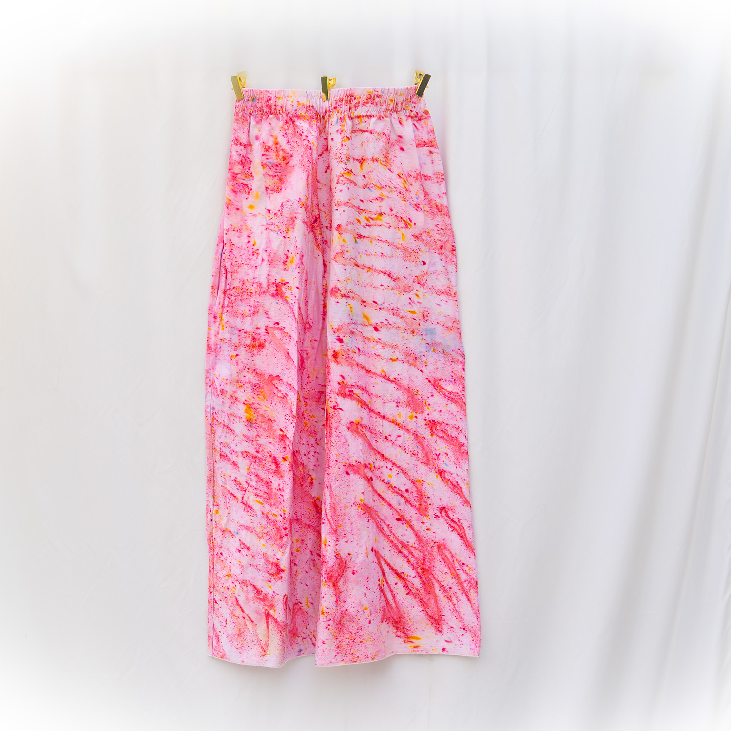 The Baby Pink Denim Pants are cut from stretch denim — 70% cotton, 28% polyester, 2% spandex — with a 32-inch waist (stretch fit) and 34-inch inseam. The elastic waistband sits flat and stays put, and the fabric has enough recovery to layer easily over leggings or yoga pants. Each pair is hand dash-dyed using Dharma Procion MX fiber reactive dye — applied in small, deliberate amounts so the pigment bonds permanently to the cotton fibers. The color is in the fiber, not on it, so it holds up through repeated washing without fading. Care: machine wash cold. Tumble dry low. Do not iron the dyed areas.