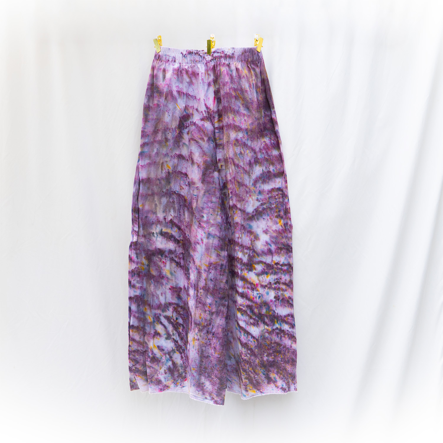 The Black Cherry Denim Pants are cut from stretch denim — 70% cotton, 28% polyester, 2% spandex — with a 32-inch waist (stretch fit) and 34-inch inseam. The elastic waistband sits flat and stays put, and the fabric has enough recovery to layer easily over leggings or yoga pants. Each pair is hand dash-dyed using Dharma Procion MX fiber reactive dye — applied in small, deliberate amounts so the pigment bonds permanently to the cotton fibers. The color is in the fiber, not on it, so it holds up through repeated washing without fading. Care: machine wash cold. Tumble dry low. Do not iron the dyed areas.