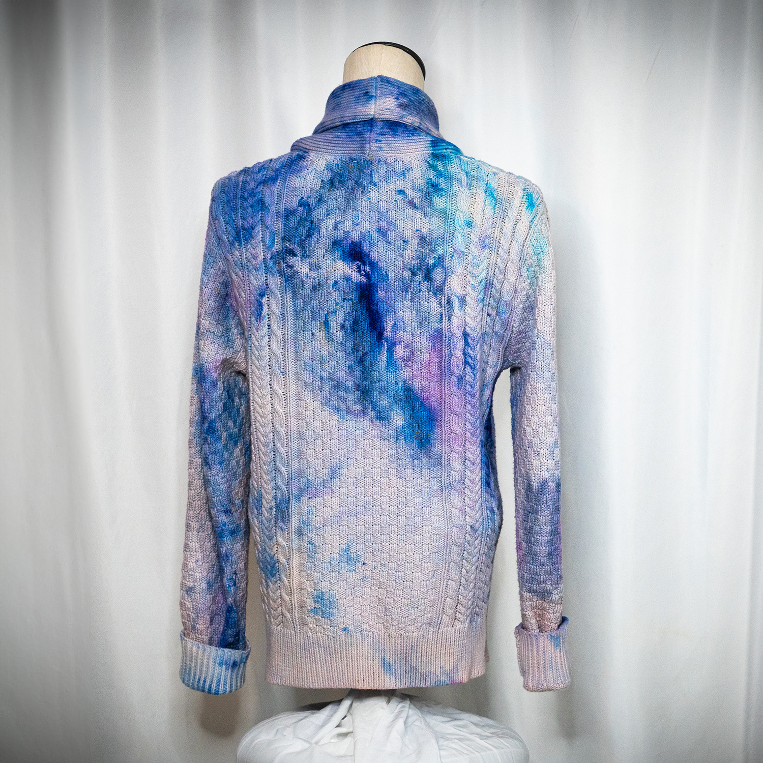 The Blue Cardigan is a J. Crew Heritage Cotton Cardigan, knit from 100% dense cotton with a classic shawl collar and cable-knit pattern. The compact knit is sturdy and breathable with a dry hand feel — structured enough to hold its shape, relaxed enough to wear all day. Each piece is hand dash-dyed using Dharma Procion MX fiber reactive dye applied in small, deliberate amounts so the color sets permanently into the cotton. Sizing is unisex. Care: machine wash cold. Lay flat to dry to preserve the knit structure.