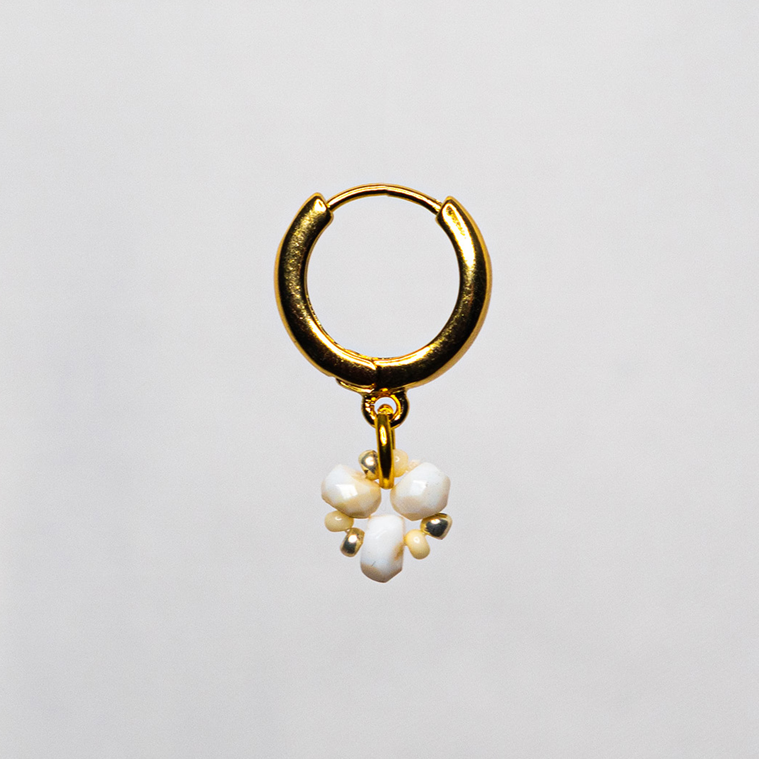 The Bone Opal Earrings pair Opal gemstones with Czech Preciosa Ornela beads on 18k gold huggie hoops — small enough to wear every day, interesting enough to earn a compliment.