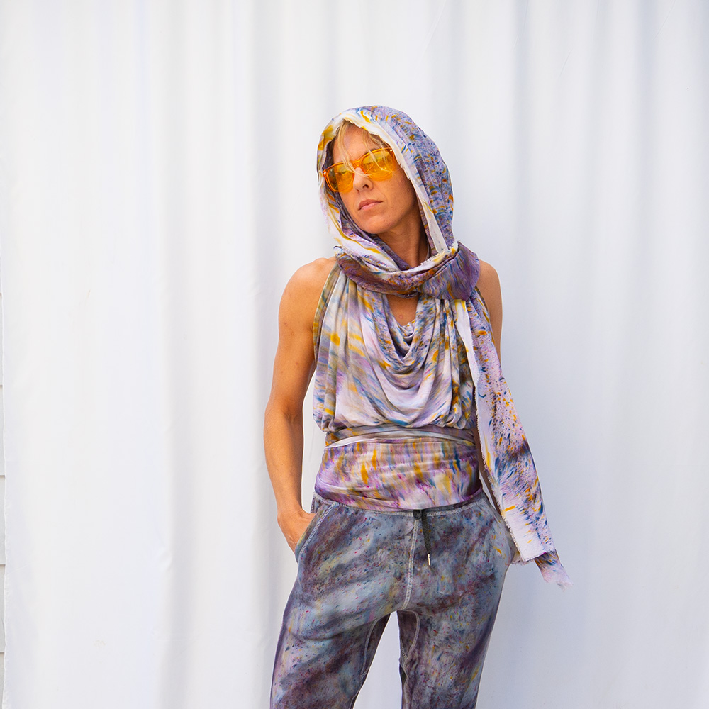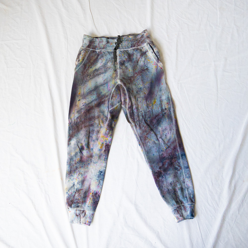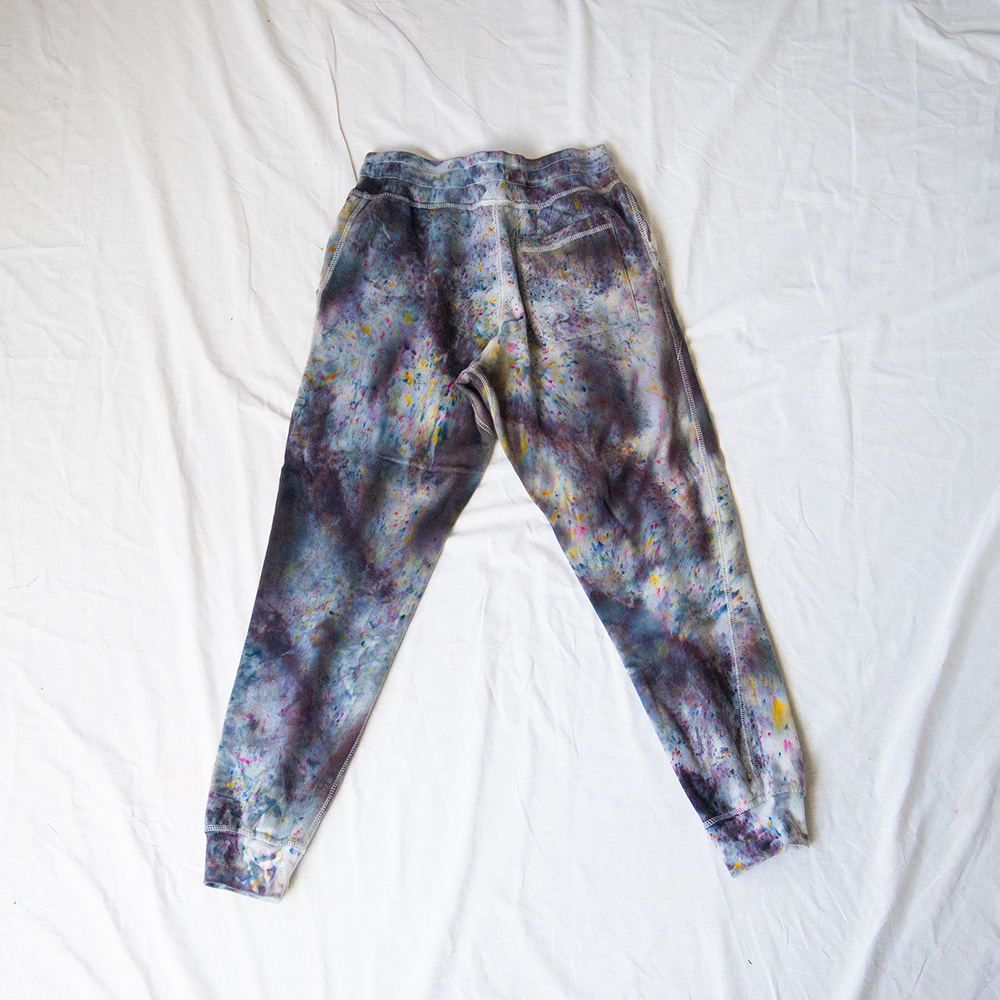 The Brushed Steel Joggers are cut from heavy-weight fleece — 80% cotton, 20% polyester — with a flat elastic waistband, cuff-ribbed ankles, two front pockets, and one back pocket. The drop crotch and tapered leg give a relaxed fit through the hip with a clean line from the knee down. Each pair is hand dash-dyed using Dharma Procion MX fiber reactive dye — a powder pigment applied in small, intentional dashes and fixed permanently into the cotton fibers. Care: machine wash cold. Tumble dry low. Do not iron the dyed areas.