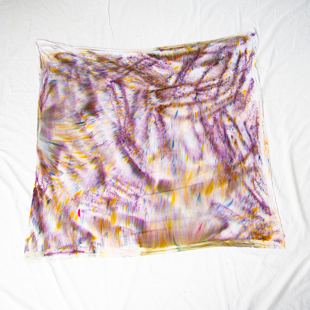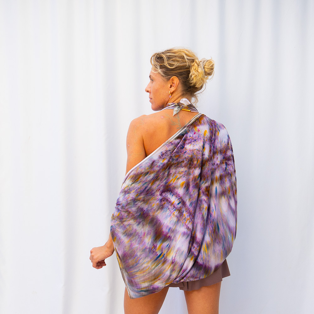 The Brushed Steel Halter Scarf is a 40×40 inch square cut from ultra-soft Rayon + Spandex knit. The knit construction has gentle stretch and recovery, draping softly against the body and holding its shape through repeated styling. Each piece is hand dash-dyed using Dharma Procion MX fiber reactive dye — applied in small, intentional amounts so color bonds permanently to the fiber. The result is a luminous, slightly varied depth of tone unique to each piece. Care: machine wash cold, gentle cycle. Lay flat or hang to dry. Do not iron.
