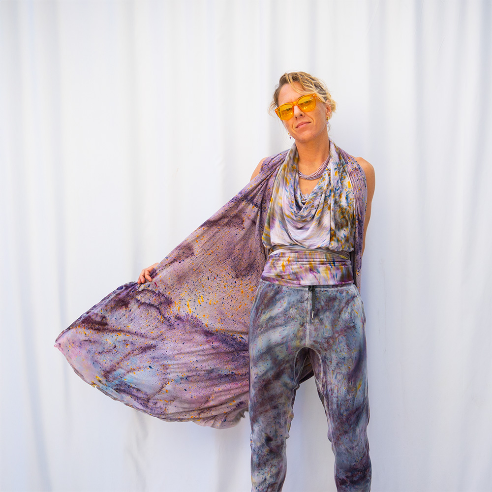 The Charcoal Drape Shawl is a 50×60 inches rectangle cut from ultra-soft Rayon + Spandex knit. The knit construction stretches gently with the body and rebounds without sagging, making it wearable as a shawl, an open cardigan, or an oversized wrap. Each piece is hand dash-dyed using Dharma Procion MX fiber reactive dye — a reactive powder pigment that bonds permanently to the fiber rather than sitting on top. Color depth varies subtly across each piece, making every one unique. Care: machine wash cold, gentle cycle. Lay flat to dry. Do not iron.
