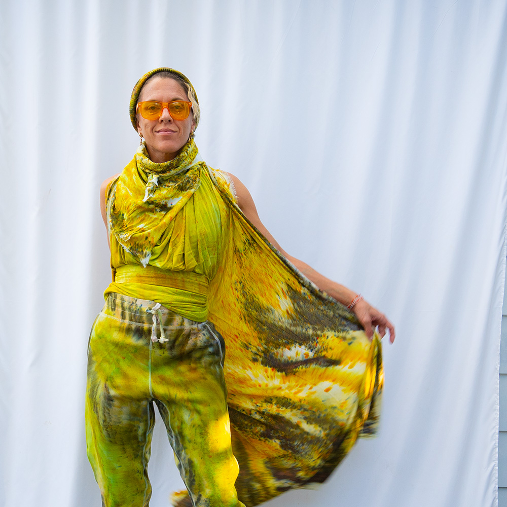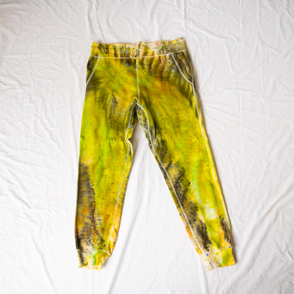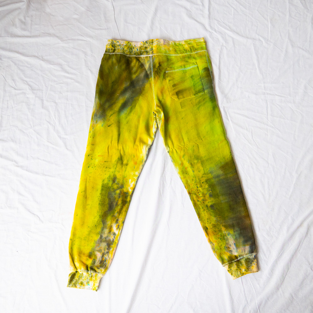 The Chartreuse Joggers are cut from heavy-weight fleece — 80% cotton, 20% polyester — with a flat elastic waistband, cuff-ribbed ankles, two front pockets, and one back pocket. The drop crotch and tapered leg give a relaxed fit through the hip with a clean line from the knee down. Each pair is hand dash-dyed using Dharma Procion MX fiber reactive dye — a powder pigment applied in small, intentional dashes and fixed permanently into the cotton fibers. Care: machine wash cold. Tumble dry low. Do not iron the dyed areas.