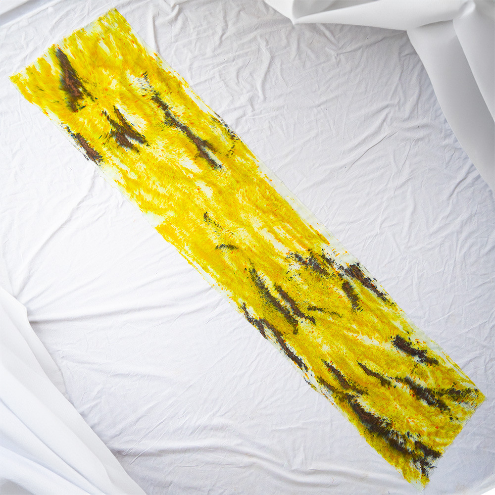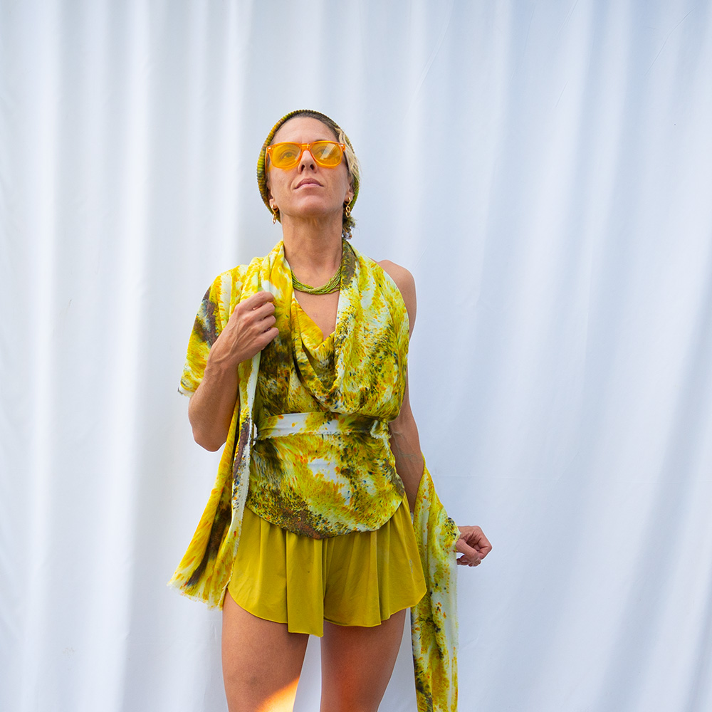 The Chartreuse Slim Wrap is a 20×72 inch rectangle cut from 100% Rayon with eyelash fringe. The woven rayon has a silky drape and a slight sheen that catches light as you move. Each piece is hand dash-dyed using Dharma Procion MX fiber reactive dye — applied in intentional dashes so color saturates the fiber permanently. Care: machine wash cold, gentle cycle. Hang to dry. Iron on low heat.