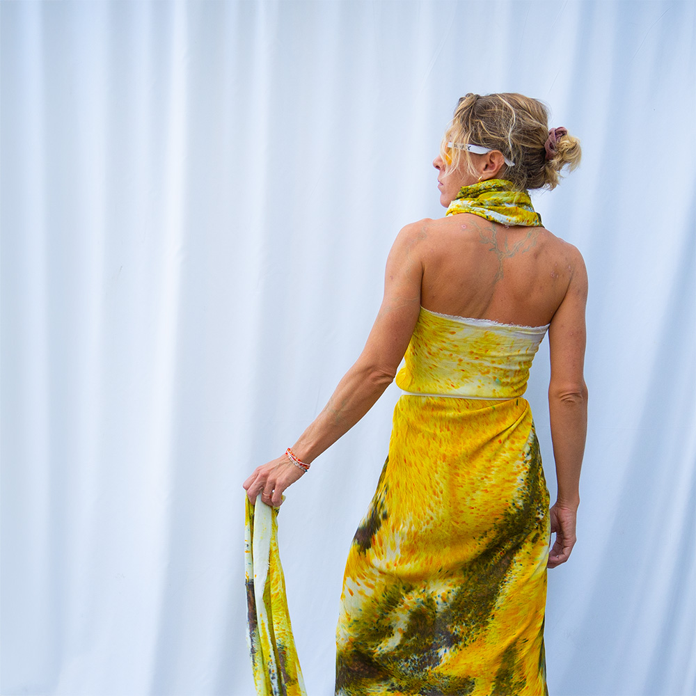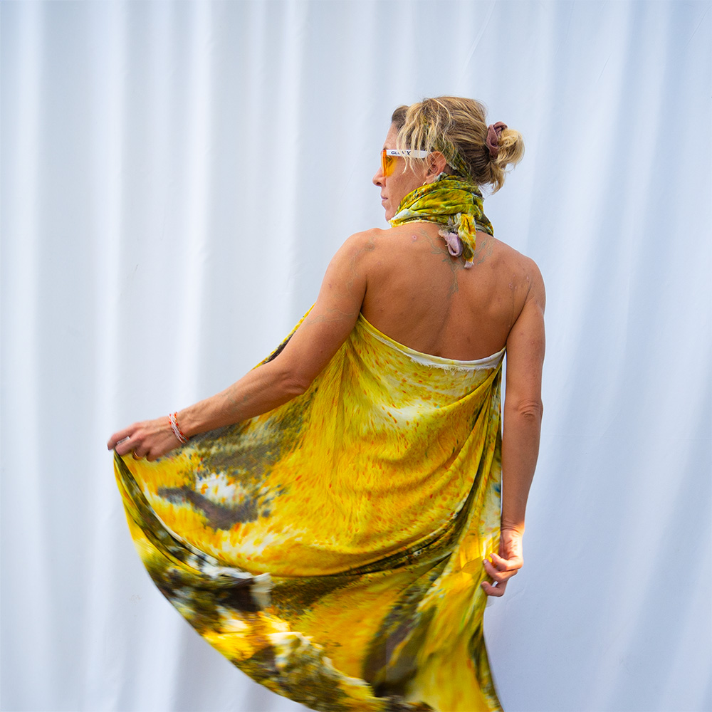 The Chartreuse Square Wrap is a 50×50 inch square cut from 100% rayon. The generous size gives you full coverage as a wrap or shawl, and the lightweight rayon means it packs into nothing and emerges wrinkle-free. Each piece is hand dash-dyed using Dharma Procion MX fiber reactive dye — powder pigment fixed permanently into the fiber in small, deliberate dashes. The color is set, not coated, so it remains vivid through years of washing. Care: machine wash cold, regular cycle. Lay flat to dry. Do not iron.