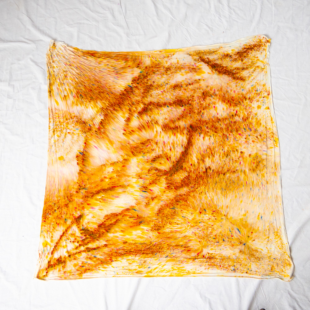 The Cinnamon Halter Scarf is a 40×40 inch square cut from ultra-soft Rayon + Spandex knit. The knit construction has gentle stretch and recovery, draping softly against the body and holding its shape through repeated styling. Each piece is hand dash-dyed using Dharma Procion MX fiber reactive dye — applied in small, intentional amounts so color bonds permanently to the fiber. The result is a luminous, slightly varied depth of tone unique to each piece. Care: machine wash cold, gentle cycle. Lay flat or hang to dry. Do not iron.