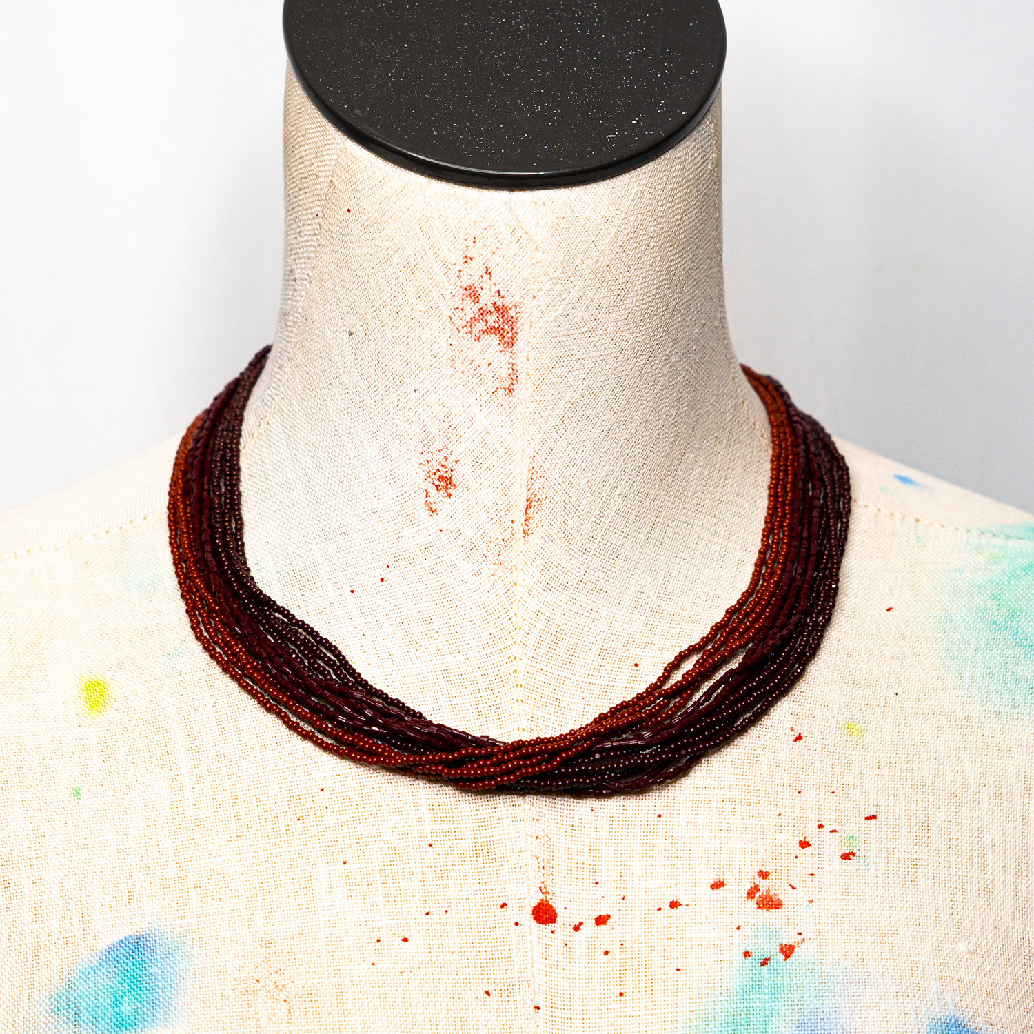 The Cinnamon Necklace is 18 inches long and built from 12 strands of traditional Czech Preciosa Ornela seed beads — some of the finest glass beads made, known for consistent size, shape, and depth of color. Three magnetic clasps make it easy to put on and take off, and the strand construction means it drapes with a satisfying weight and texture. Each necklace is assembled by hand. Care: store in a cool, dry place. Avoid moisture and direct sunlight. Clean with a dry cloth.