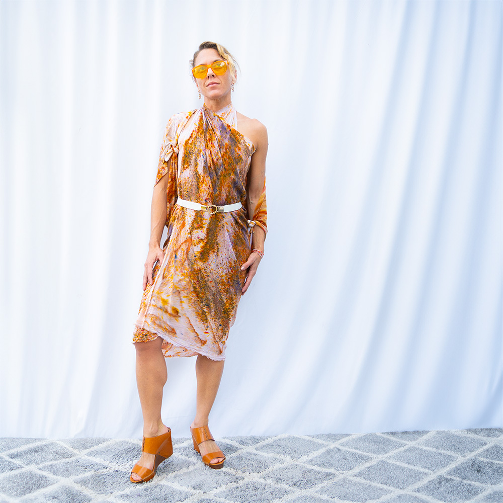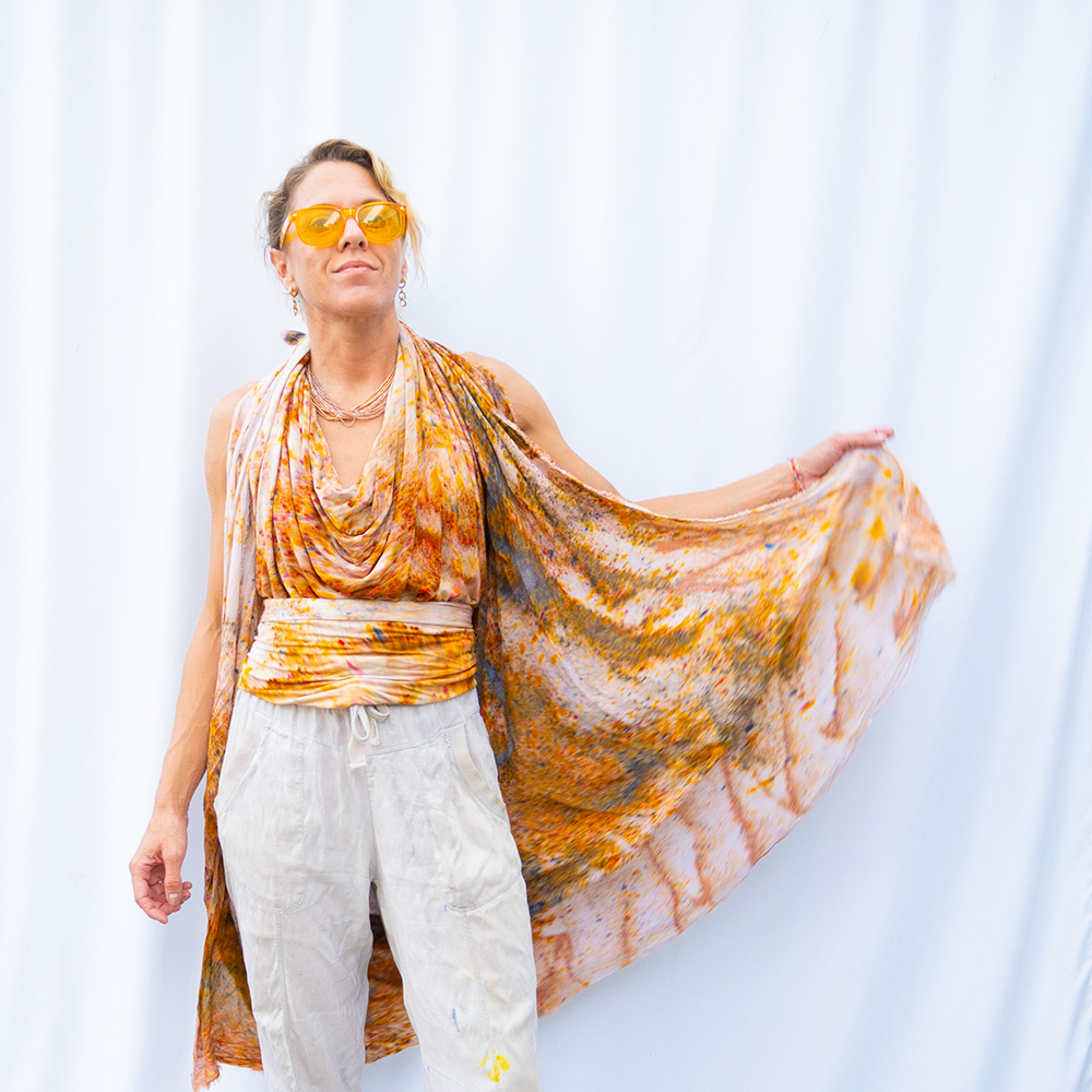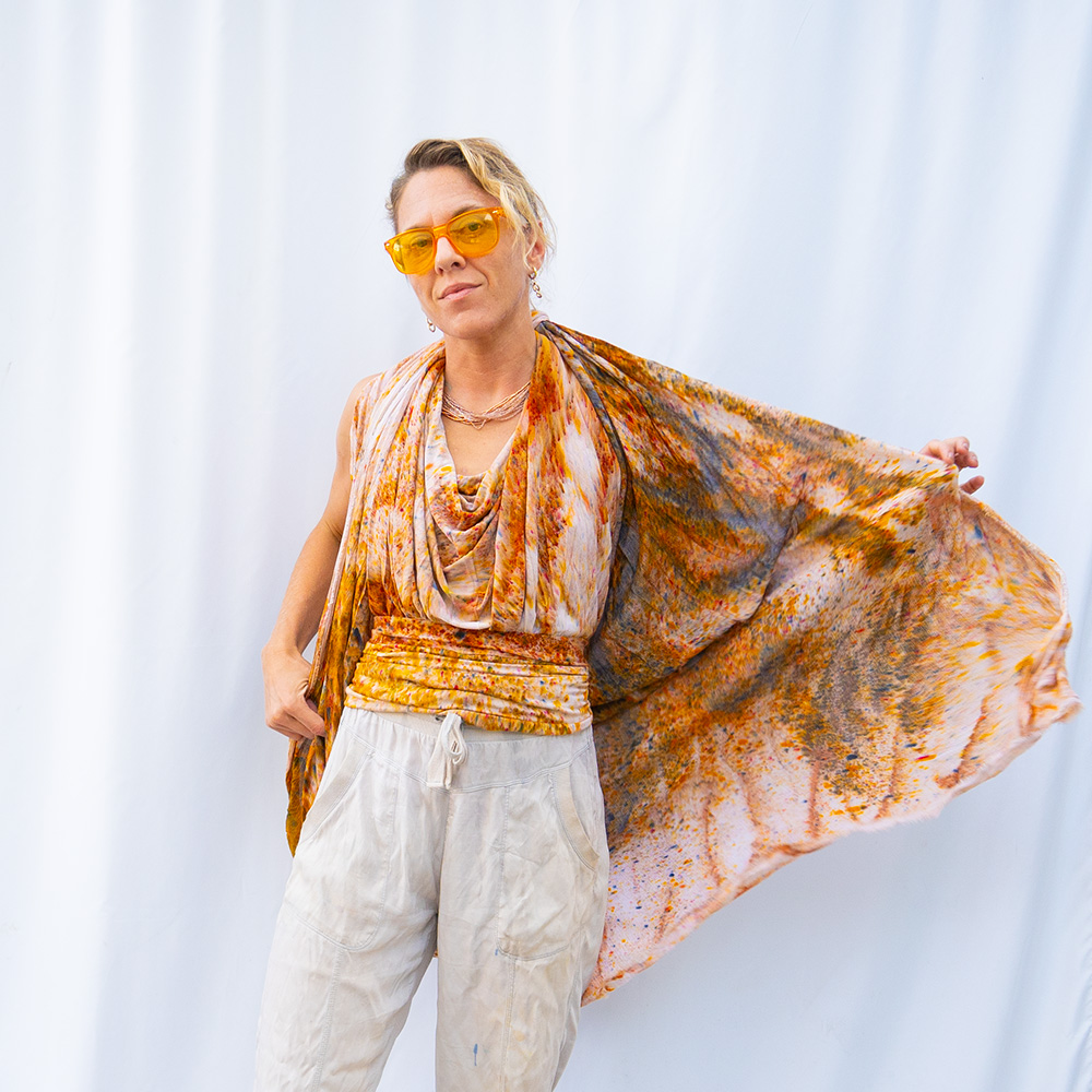 The Cinnamon Square Wrap is a 50×50 inch square cut from 100% rayon. The generous size gives you full coverage as a wrap or shawl, and the lightweight rayon means it packs into nothing and emerges wrinkle-free. Each piece is hand dash-dyed using Dharma Procion MX fiber reactive dye — powder pigment fixed permanently into the fiber in small, deliberate dashes. The color is set, not coated, so it remains vivid through years of washing. Care: machine wash cold, regular cycle. Lay flat to dry. Do not iron.