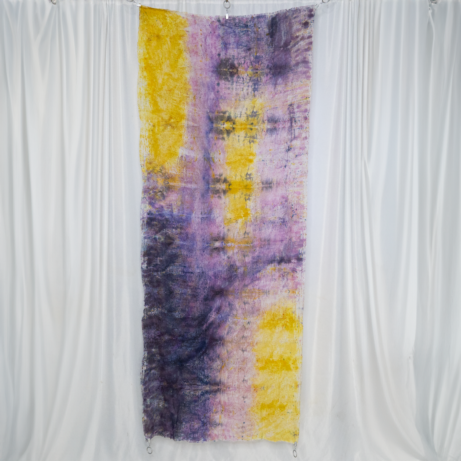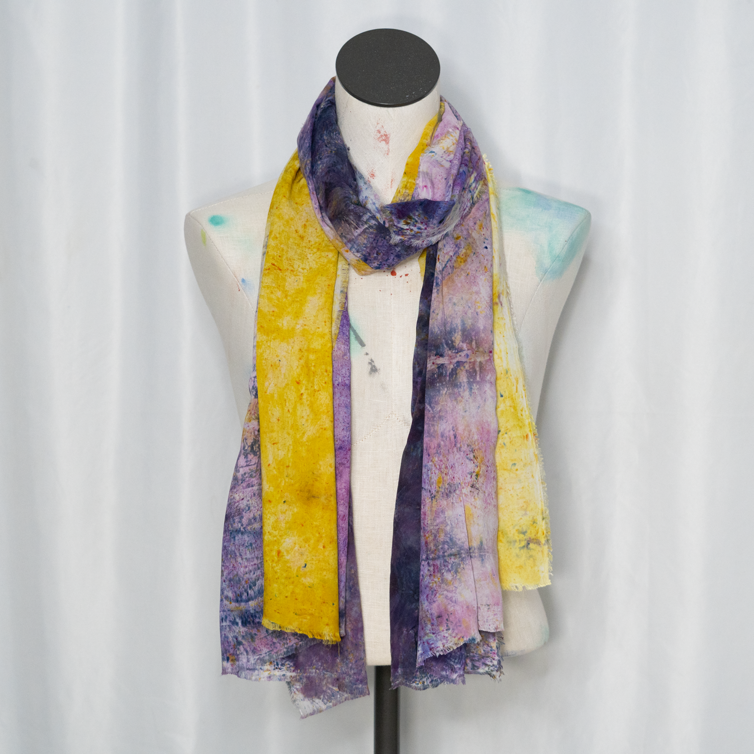 The Citrus Eggplant Slim Wrap is a 20×72 inch rectangle cut from 100% Rayon with eyelash fringe. The woven rayon has a silky drape and a slight sheen that catches light as you move. Each piece is hand dash-dyed using Dharma Procion MX fiber reactive dye — applied in intentional dashes so color saturates the fiber permanently. Care: machine wash cold, gentle cycle. Hang to dry. Iron on low heat.