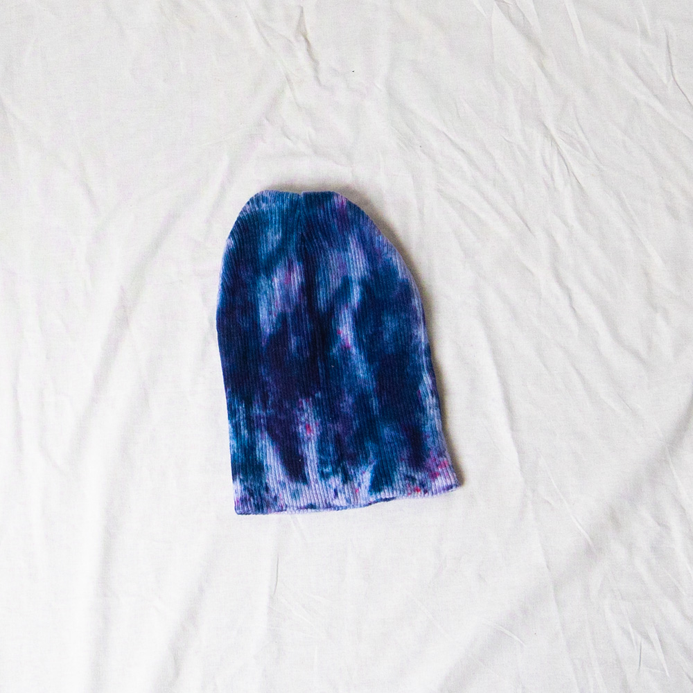 The Cobalt Beanie is knit from 100% cotton and measures approximately 7×10 inches when flat. The cotton construction breathes well and softens with washing, fitting most adult head sizes comfortably with a slight stretch. Each piece is hand dash-dyed using Dharma Procion MX fiber reactive dye — a powder pigment applied in small, intentional dashes and fixed permanently into the fiber. The color will not bleed or fade with normal washing. Care: machine wash cold, gentle cycle. Lay flat to dry.