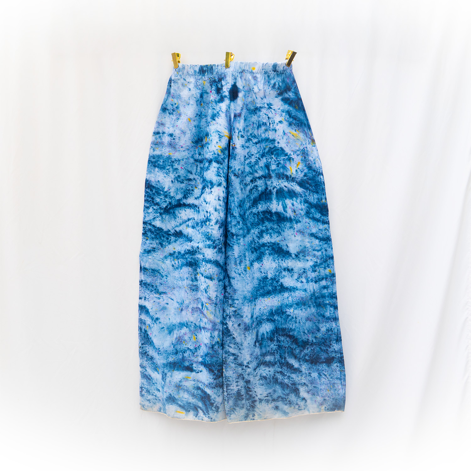 The Cobalt Denim Pants are cut from stretch denim — 70% cotton, 28% polyester, 2% spandex — with a 32-inch waist (stretch fit) and 34-inch inseam. The elastic waistband sits flat and stays put, and the fabric has enough recovery to layer easily over leggings or yoga pants. Each pair is hand dash-dyed using Dharma Procion MX fiber reactive dye — applied in small, deliberate amounts so the pigment bonds permanently to the cotton fibers. The color is in the fiber, not on it, so it holds up through repeated washing without fading. Care: machine wash cold. Tumble dry low. Do not iron the dyed areas.