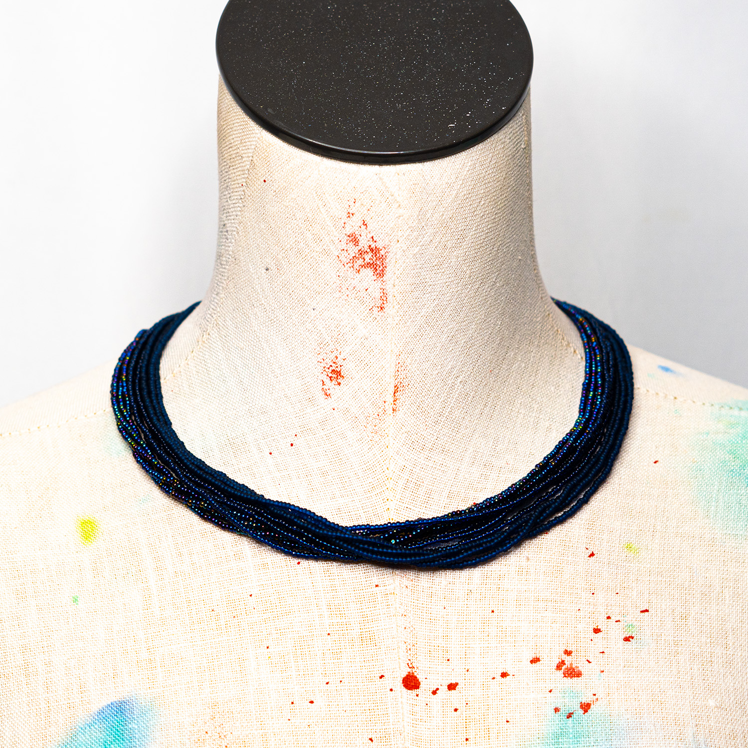 The Cobalt Necklace is 18 inches long and built from 12 strands of traditional Czech Preciosa Ornela seed beads — some of the finest glass beads made, known for consistent size, shape, and depth of color. Three magnetic clasps make it easy to put on and take off, and the strand construction means it drapes with a satisfying weight and texture. Each necklace is assembled by hand. Care: store in a cool, dry place. Avoid moisture and direct sunlight. Clean with a dry cloth.