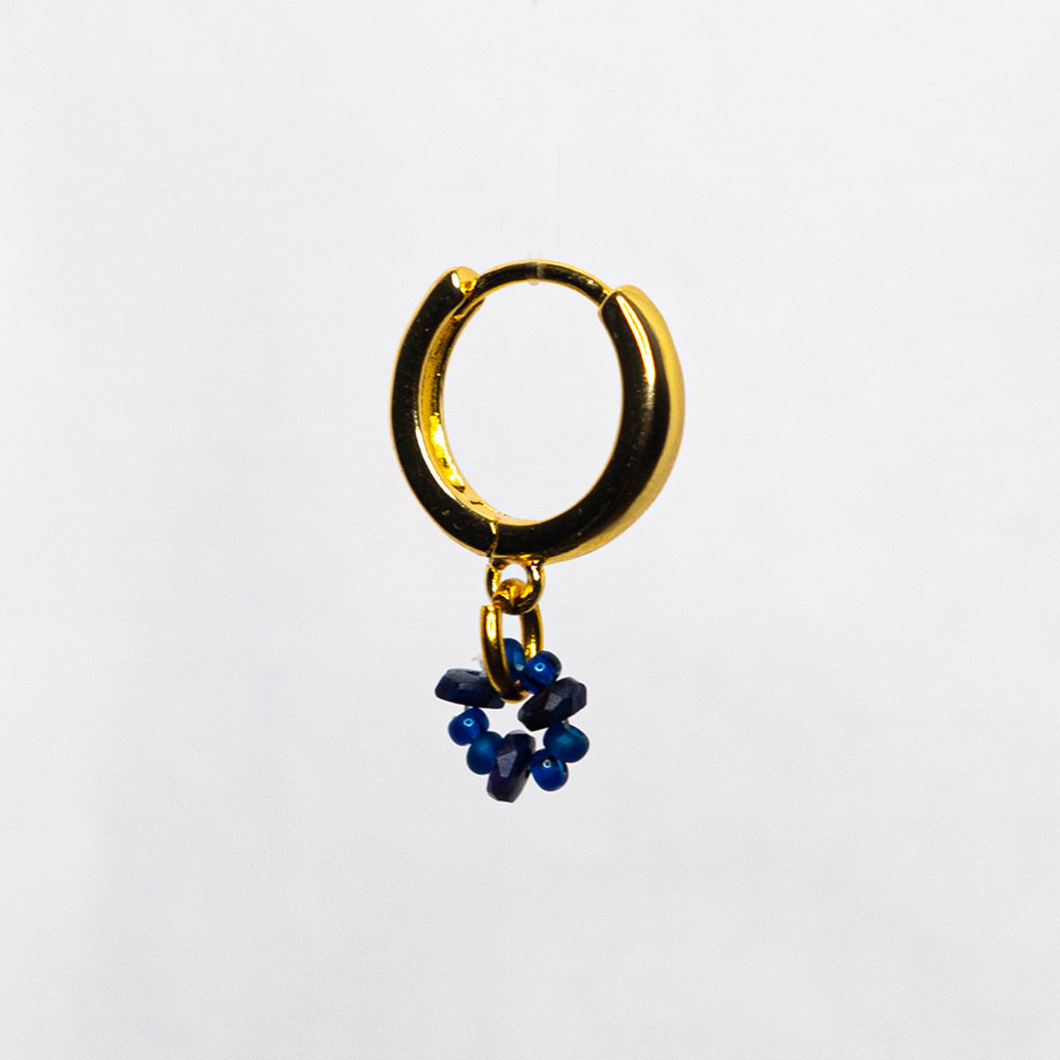 The Cobalt Sapphire Earrings pair Sapphire gemstones with Czech Preciosa Ornela beads on 18k gold huggie hoops — small enough to wear every day, interesting enough to earn a compliment.