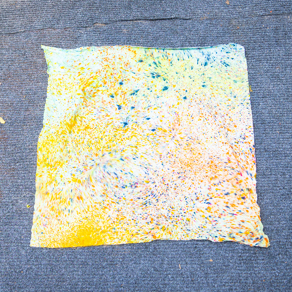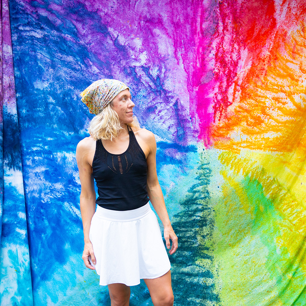 The Cotton Community Tapestry Bandana is a 22×22 inch square cut from Rayon + Spandex. The rayon-spandex blend has a soft stretch and a smooth hand feel. Each piece is hand dash-dyed using Dharma Procion MX fiber reactive dye, setting color permanently into the fiber. Care: machine wash cold. Lay flat or hang to dry.