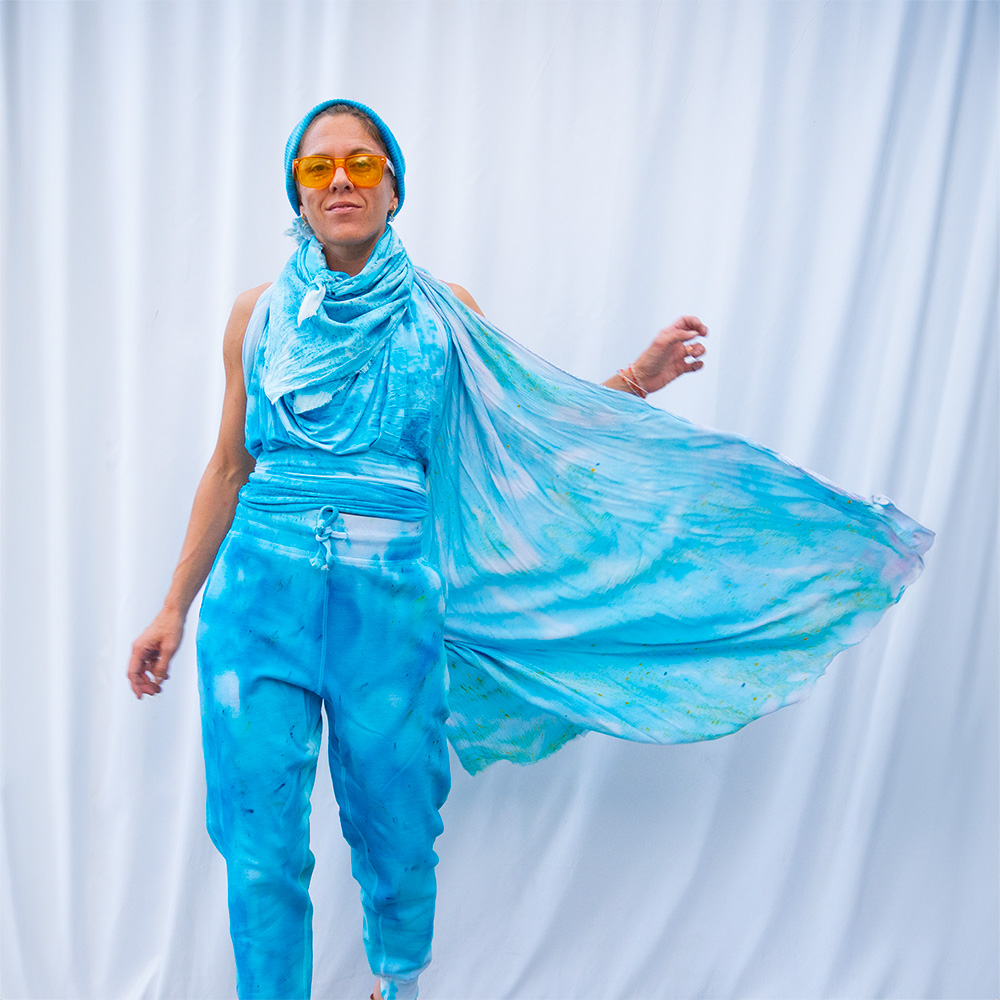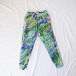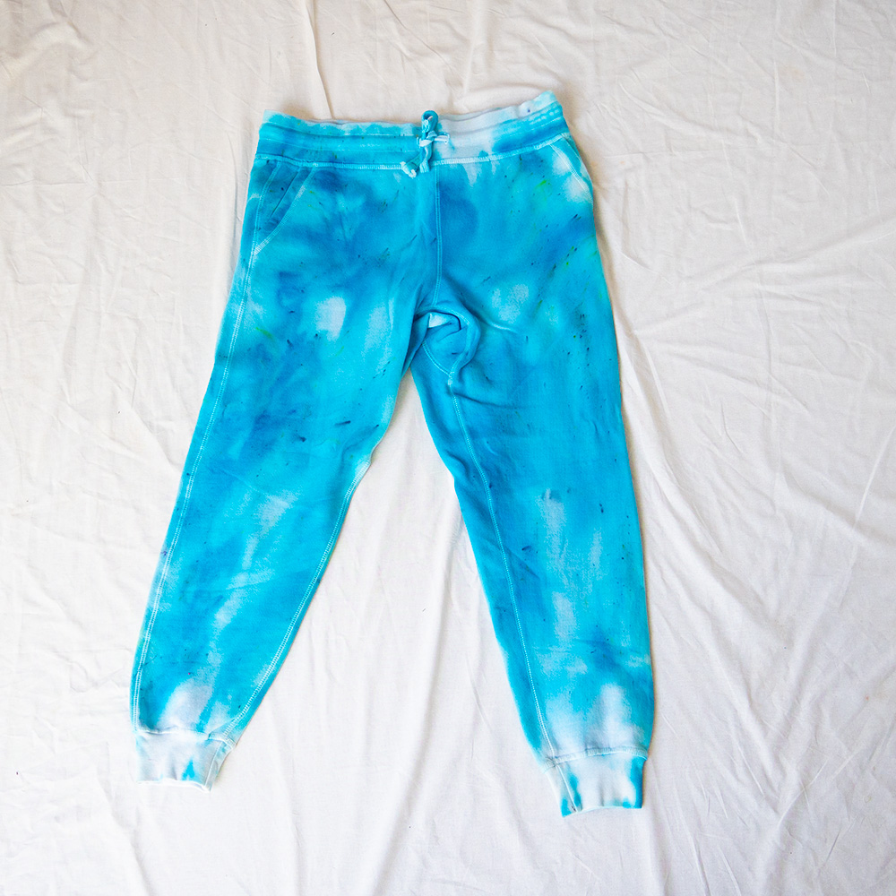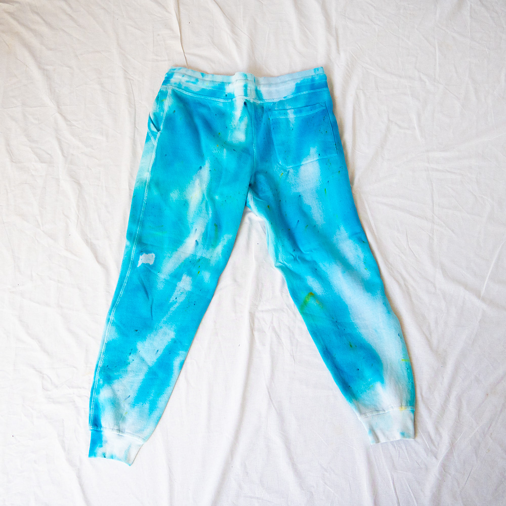 The Cyan Joggers are cut from heavy-weight fleece — 80% cotton, 20% polyester — with a flat elastic waistband, cuff-ribbed ankles, two front pockets, and one back pocket. The drop crotch and tapered leg give a relaxed fit through the hip with a clean line from the knee down. Each pair is hand dash-dyed using Dharma Procion MX fiber reactive dye — a powder pigment applied in small, intentional dashes and fixed permanently into the cotton fibers. Care: machine wash cold. Tumble dry low. Do not iron the dyed areas.