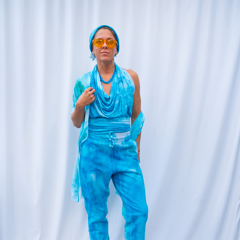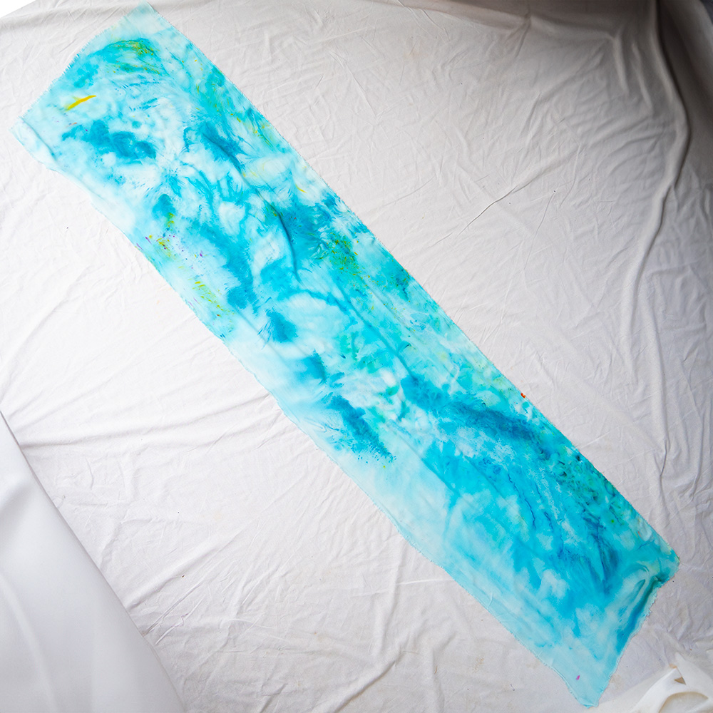 The Cyan Slim Wrap is a 20×72 inch rectangle cut from 100% Rayon with eyelash fringe. The woven rayon has a silky drape and a slight sheen that catches light as you move. Each piece is hand dash-dyed using Dharma Procion MX fiber reactive dye — applied in intentional dashes so color saturates the fiber permanently. Care: machine wash cold, gentle cycle. Hang to dry. Iron on low heat.