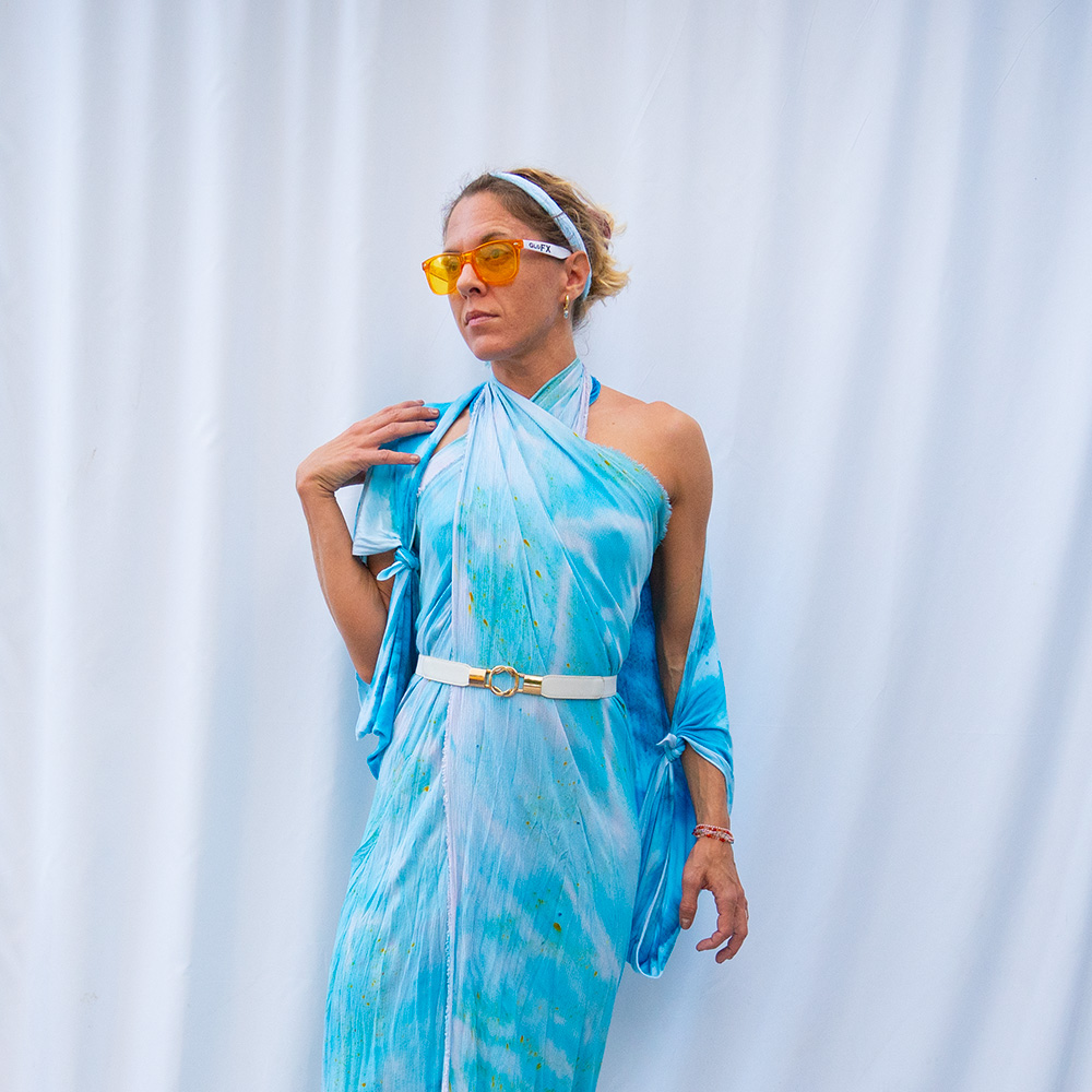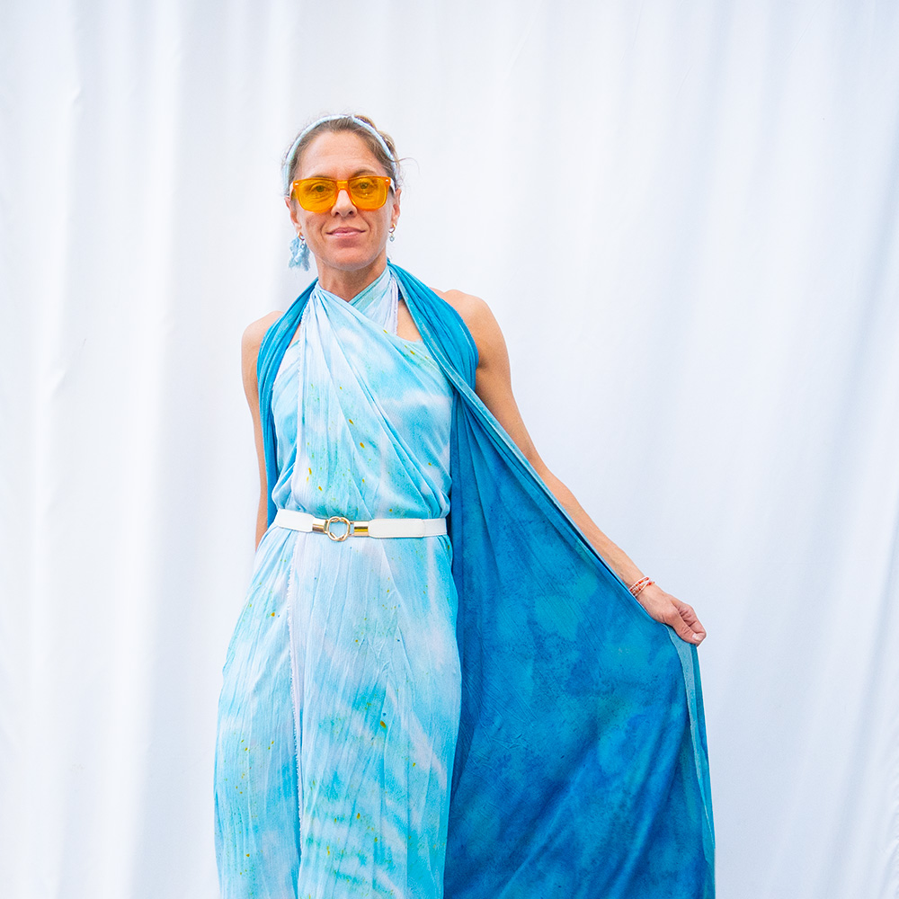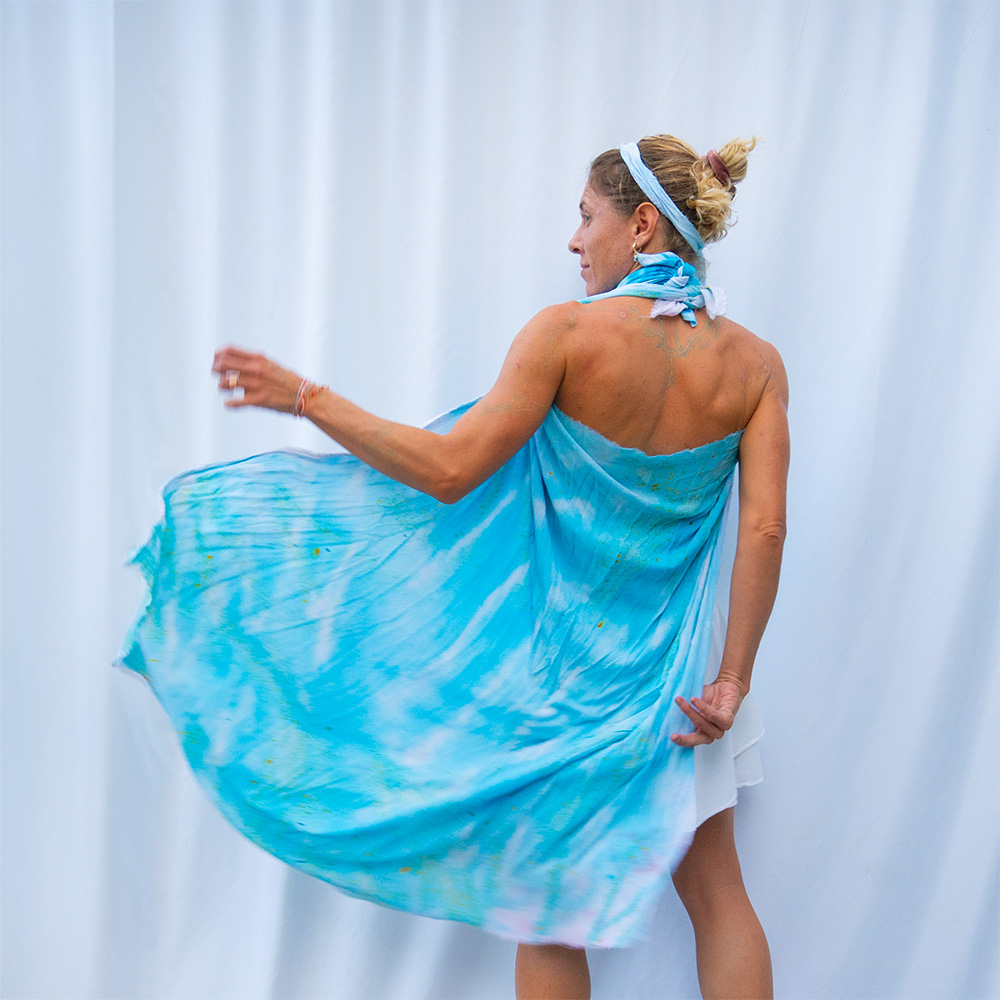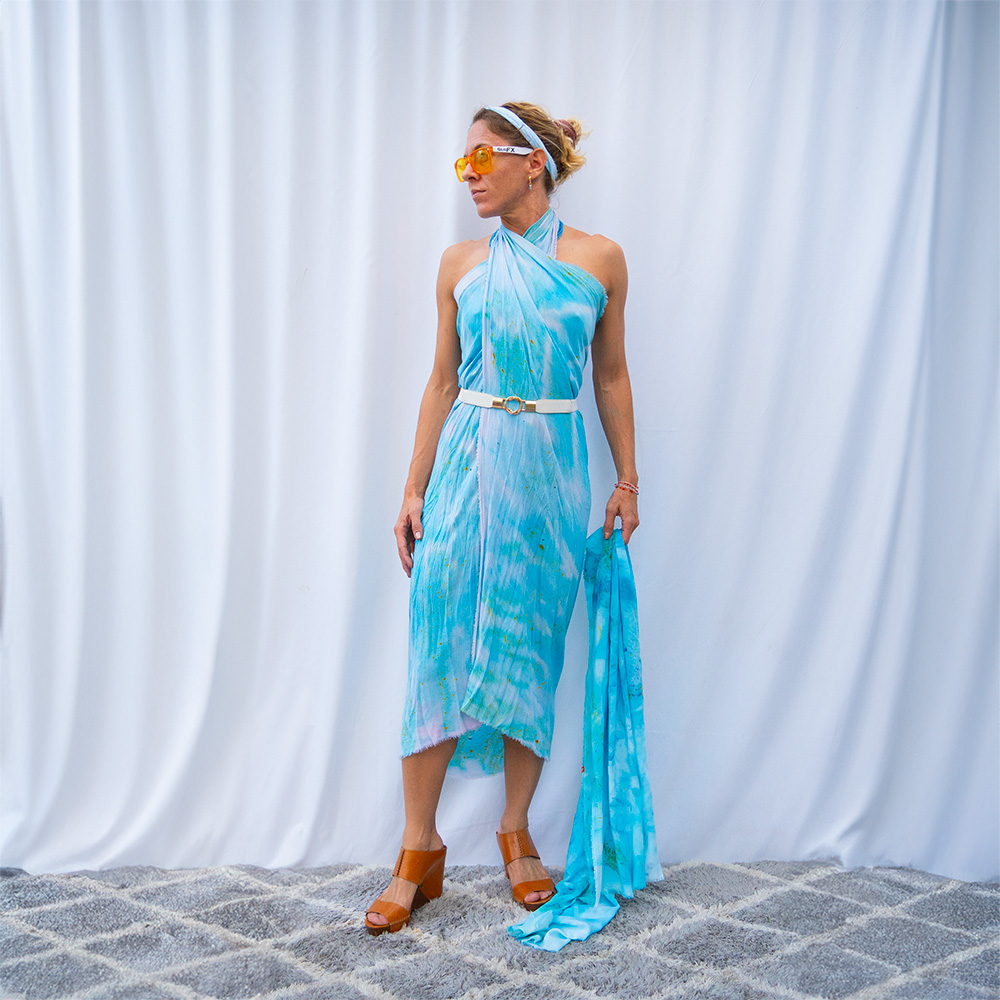The Cyan Square Wrap is a 50×50 inch square cut from 100% rayon. The generous size gives you full coverage as a wrap or shawl, and the lightweight rayon means it packs into nothing and emerges wrinkle-free. Each piece is hand dash-dyed using Dharma Procion MX fiber reactive dye — powder pigment fixed permanently into the fiber in small, deliberate dashes. The color is set, not coated, so it remains vivid through years of washing. Care: machine wash cold, regular cycle. Lay flat to dry. Do not iron.