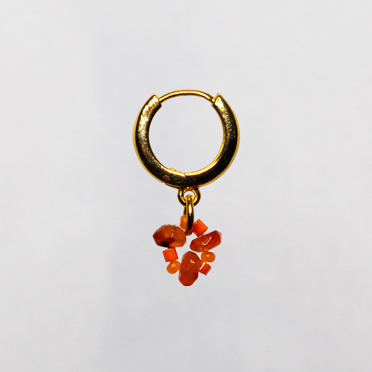 The Deep Carnelian Earrings pair Carnelian gemstones with Czech Preciosa Ornela beads on 18k gold huggie hoops — small enough to wear every day, interesting enough to earn a compliment.