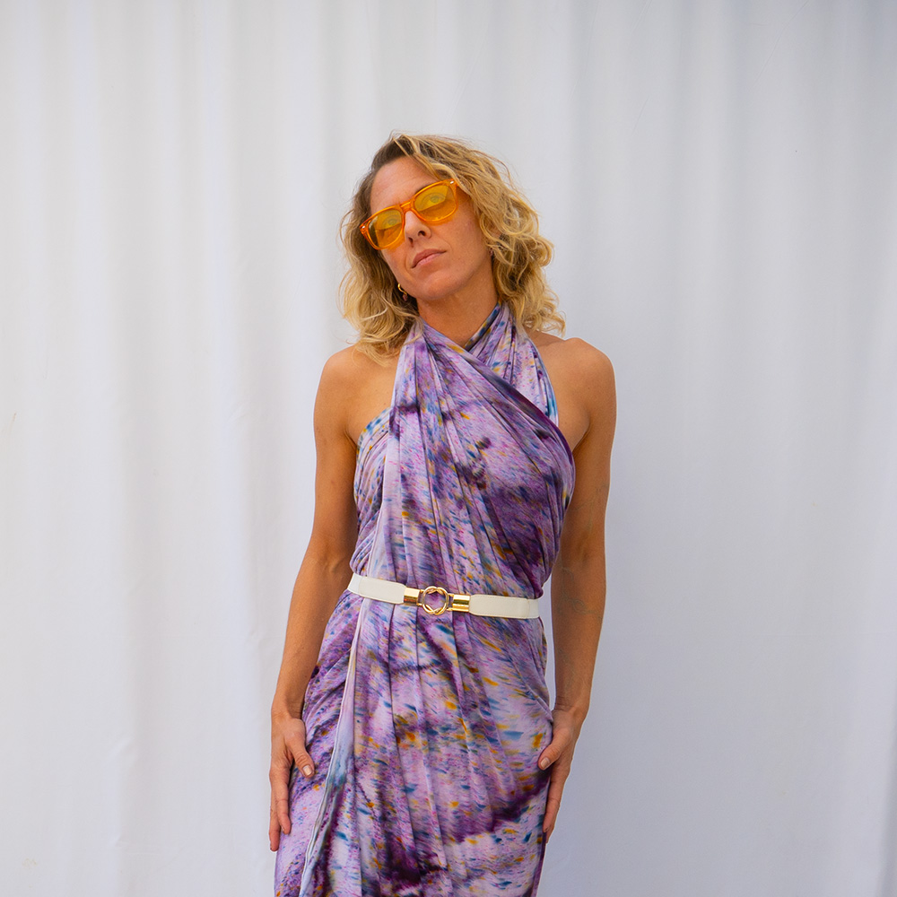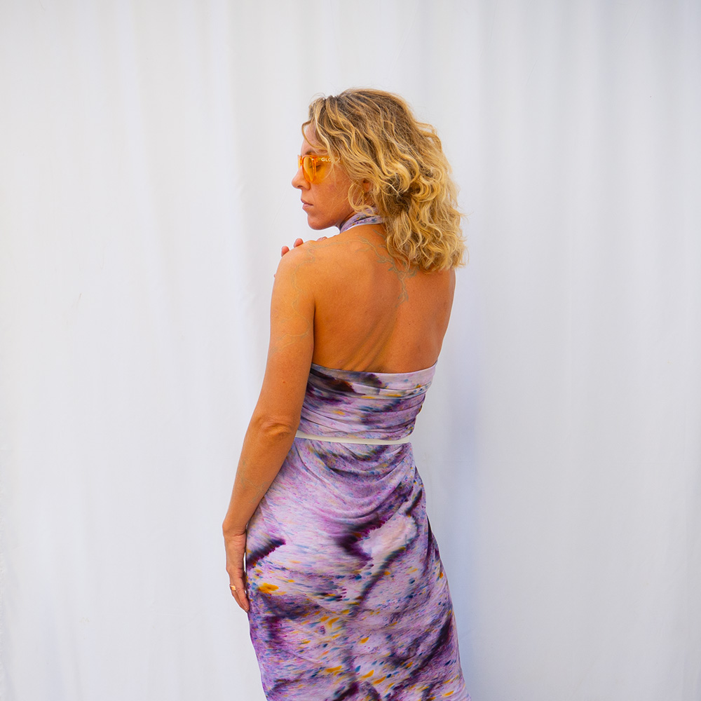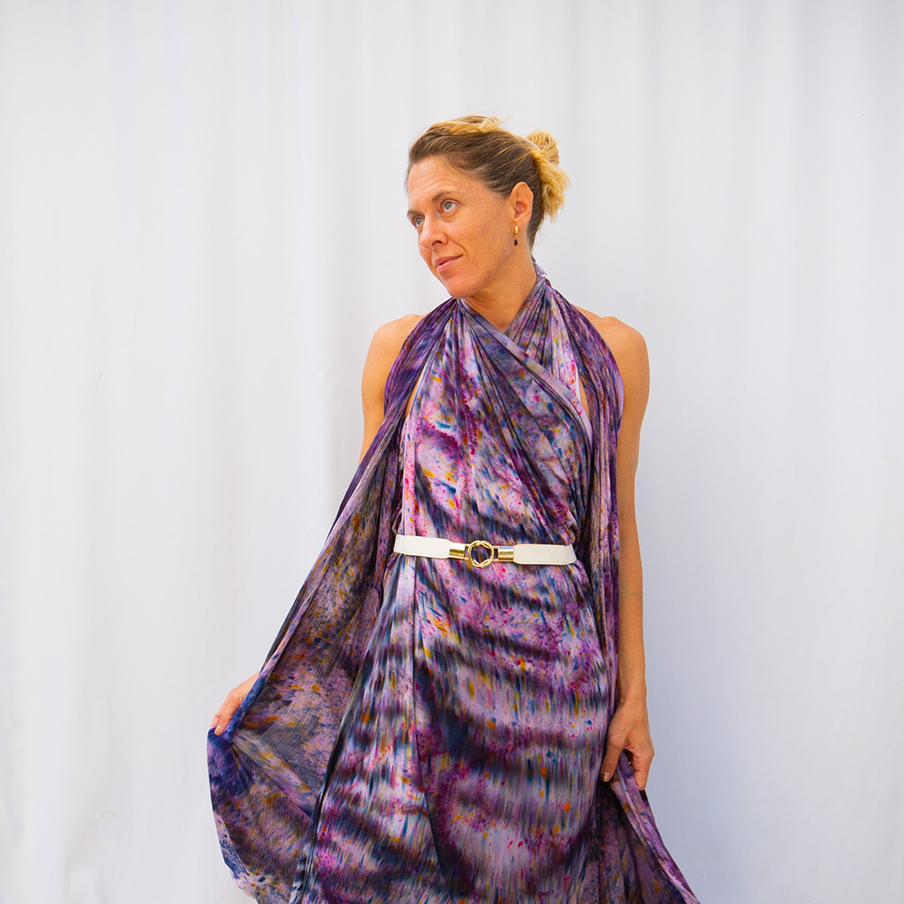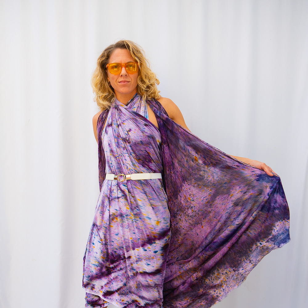 The Eggplant Drape Shawl is a 50×60 inches rectangle cut from ultra-soft Rayon + Spandex knit. The knit construction stretches gently with the body and rebounds without sagging, making it wearable as a shawl, an open cardigan, or an oversized wrap. Each piece is hand dash-dyed using Dharma Procion MX fiber reactive dye — a reactive powder pigment that bonds permanently to the fiber rather than sitting on top. Color depth varies subtly across each piece, making every one unique. Care: machine wash cold, gentle cycle. Lay flat to dry. Do not iron.