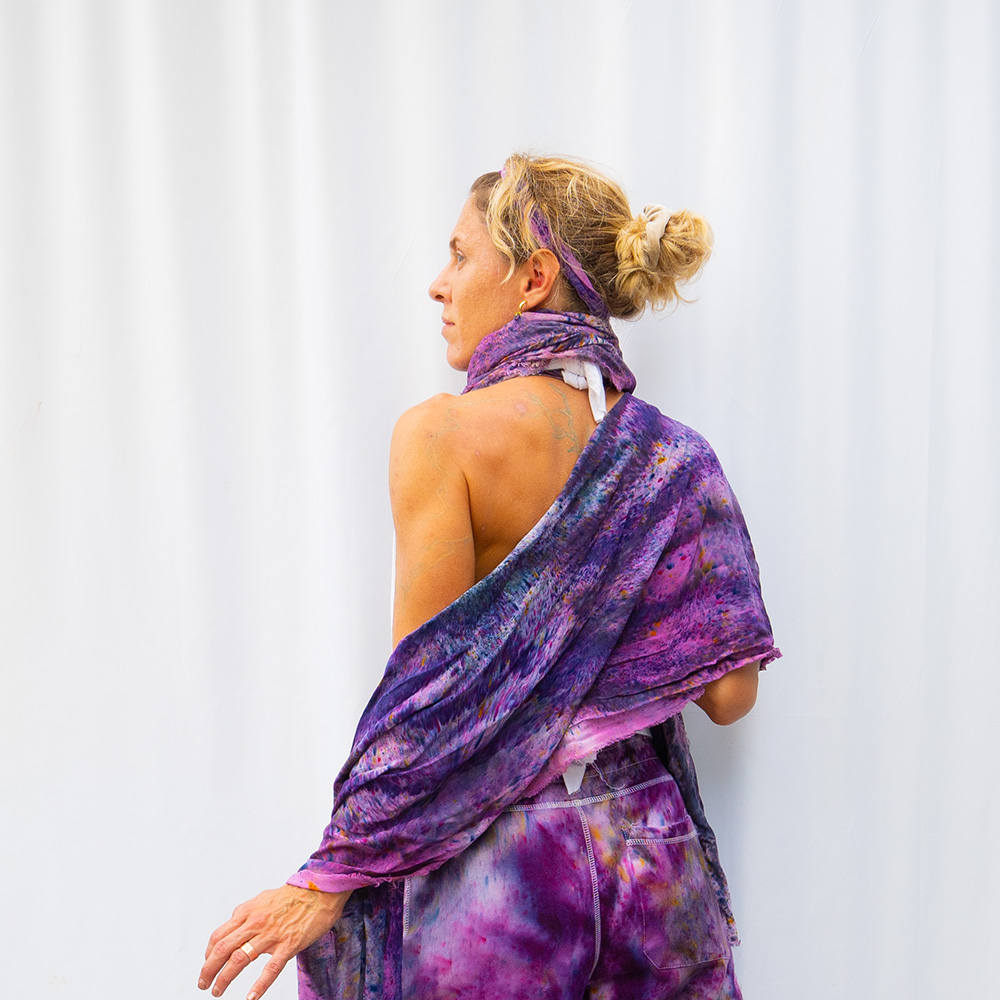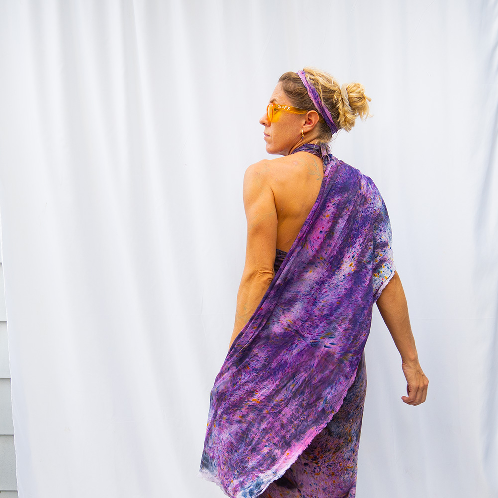 The Eggplant Slim Wrap is a 20×72 inch rectangle cut from 100% Rayon with eyelash fringe. The woven rayon has a silky drape and a slight sheen that catches light as you move. Each piece is hand dash-dyed using Dharma Procion MX fiber reactive dye — applied in intentional dashes so color saturates the fiber permanently. Care: machine wash cold, gentle cycle. Hang to dry. Iron on low heat.