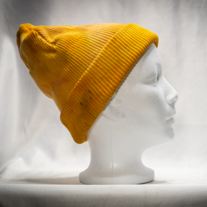 The Forest Beanie is knit from 100% cotton and measures approximately 7×10 inches when flat. The cotton construction breathes well and softens with washing, fitting most adult head sizes comfortably with a slight stretch. Each piece is hand dash-dyed using Dharma Procion MX fiber reactive dye — a powder pigment applied in small, intentional dashes and fixed permanently into the fiber. The color will not bleed or fade with normal washing. Care: machine wash cold, gentle cycle. Lay flat to dry.