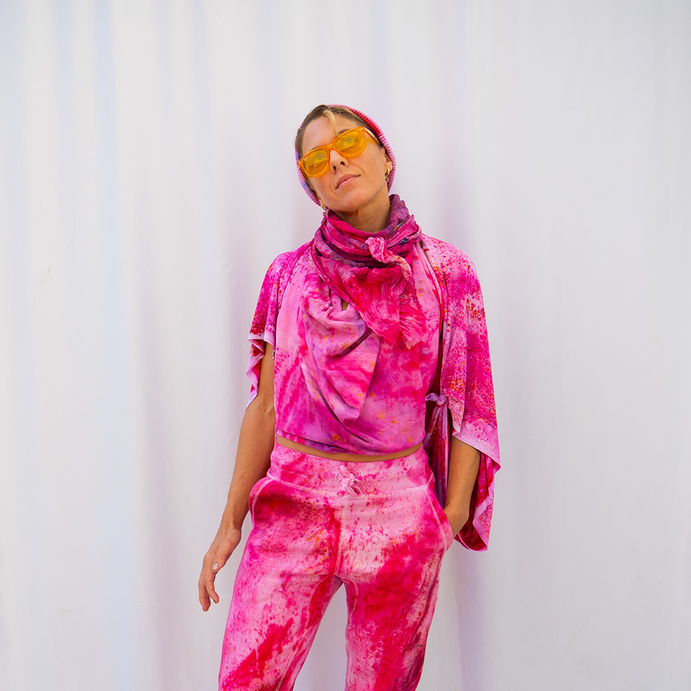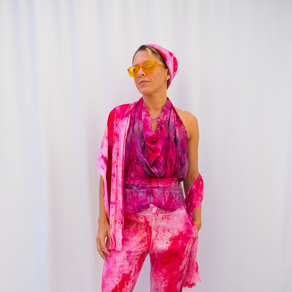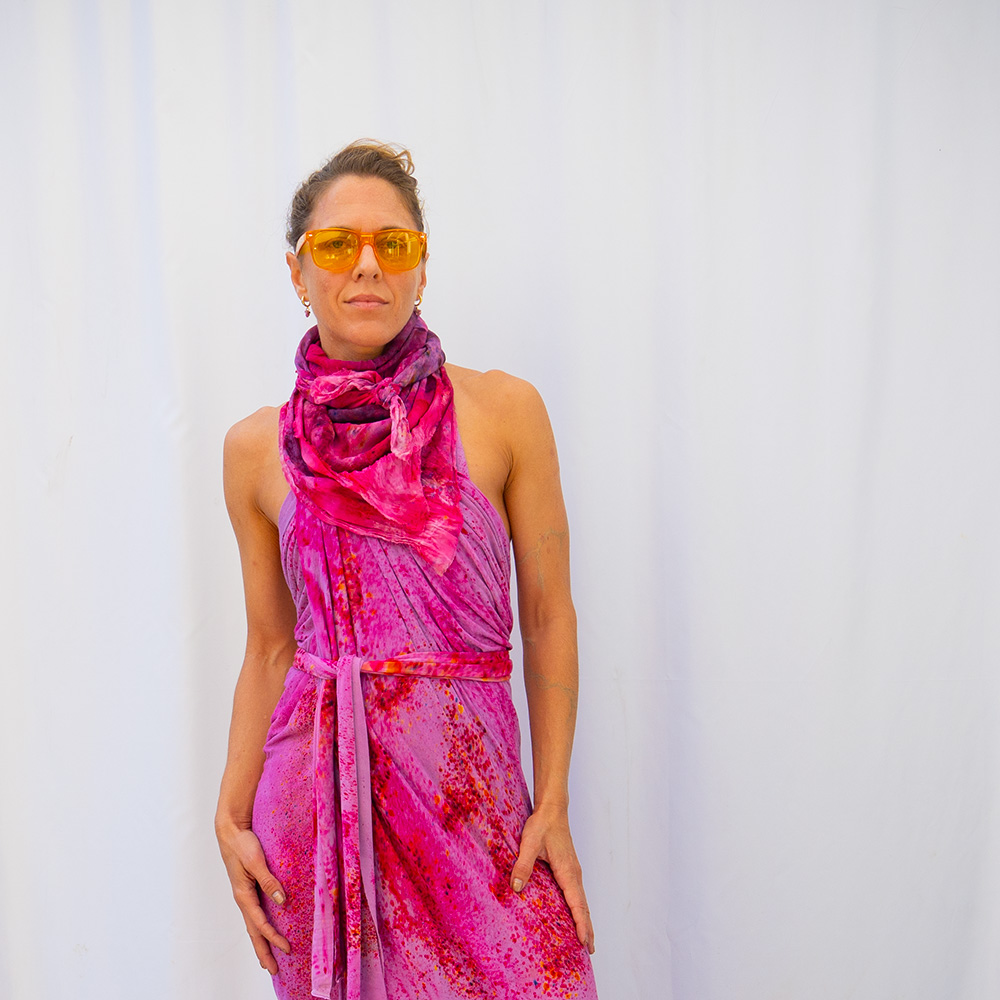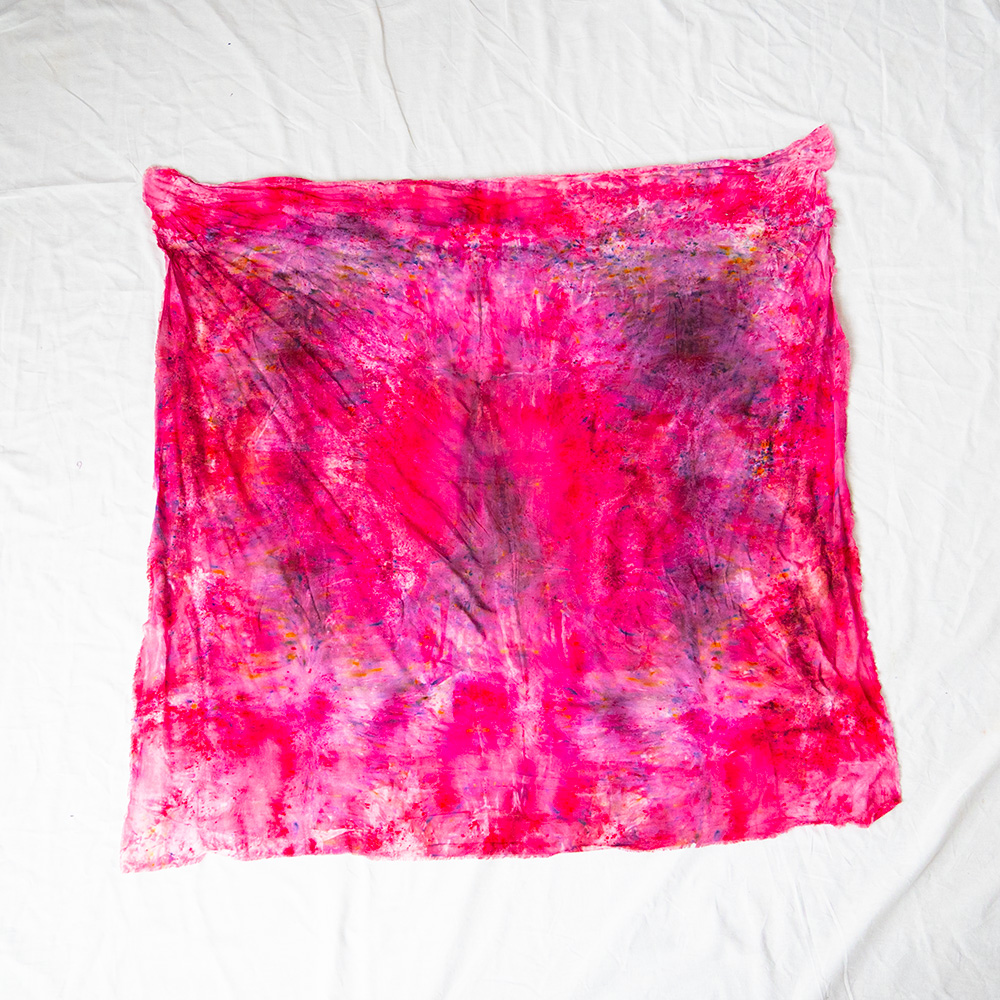 The Fuchsia Wild Rag is a 36×36 inch square scarf cut from 100% Rayon. Rayon drapes with a fluid, silk-like weight that holds a knot beautifully and moves with you all day. Each piece is hand dash-dyed using Dharma Procion MX fiber reactive dye — a powder pigment mixed with a fixative and applied in small, intentional dashes so the color sets permanently into the fiber. No two pieces are identical. Care: machine wash cold, gentle cycle. Hang or lay flat to dry. Do not iron.