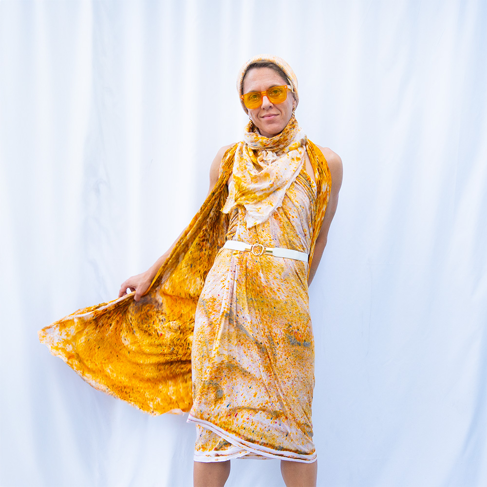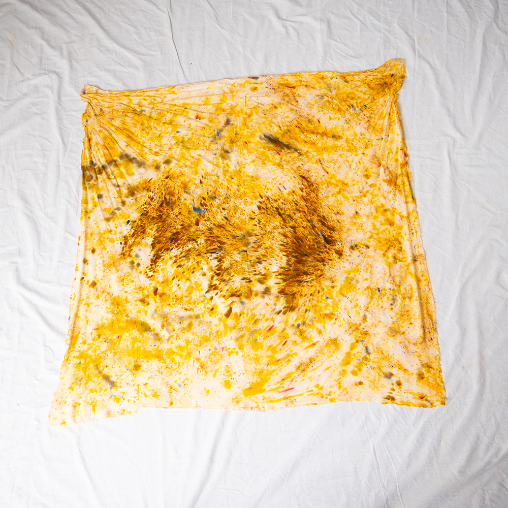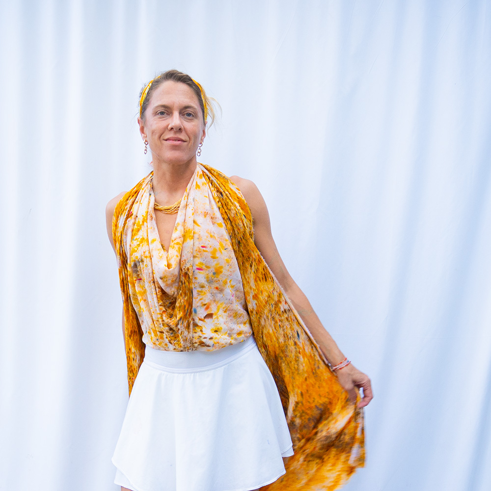 The Gold Wild Rag is a 36×36 inch square scarf cut from 100% Rayon. Rayon drapes with a fluid, silk-like weight that holds a knot beautifully and moves with you all day. Each piece is hand dash-dyed using Dharma Procion MX fiber reactive dye — a powder pigment mixed with a fixative and applied in small, intentional dashes so the color sets permanently into the fiber. No two pieces are identical. Care: machine wash cold, gentle cycle. Hang or lay flat to dry. Do not iron.