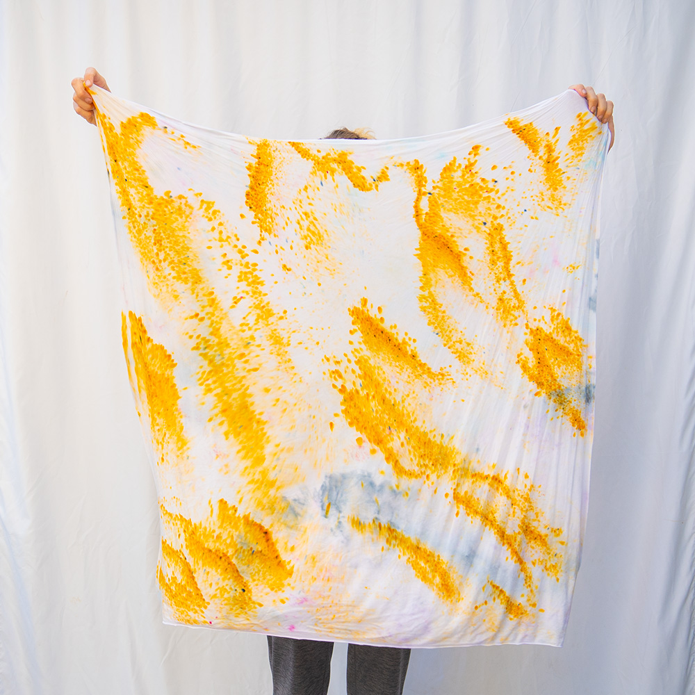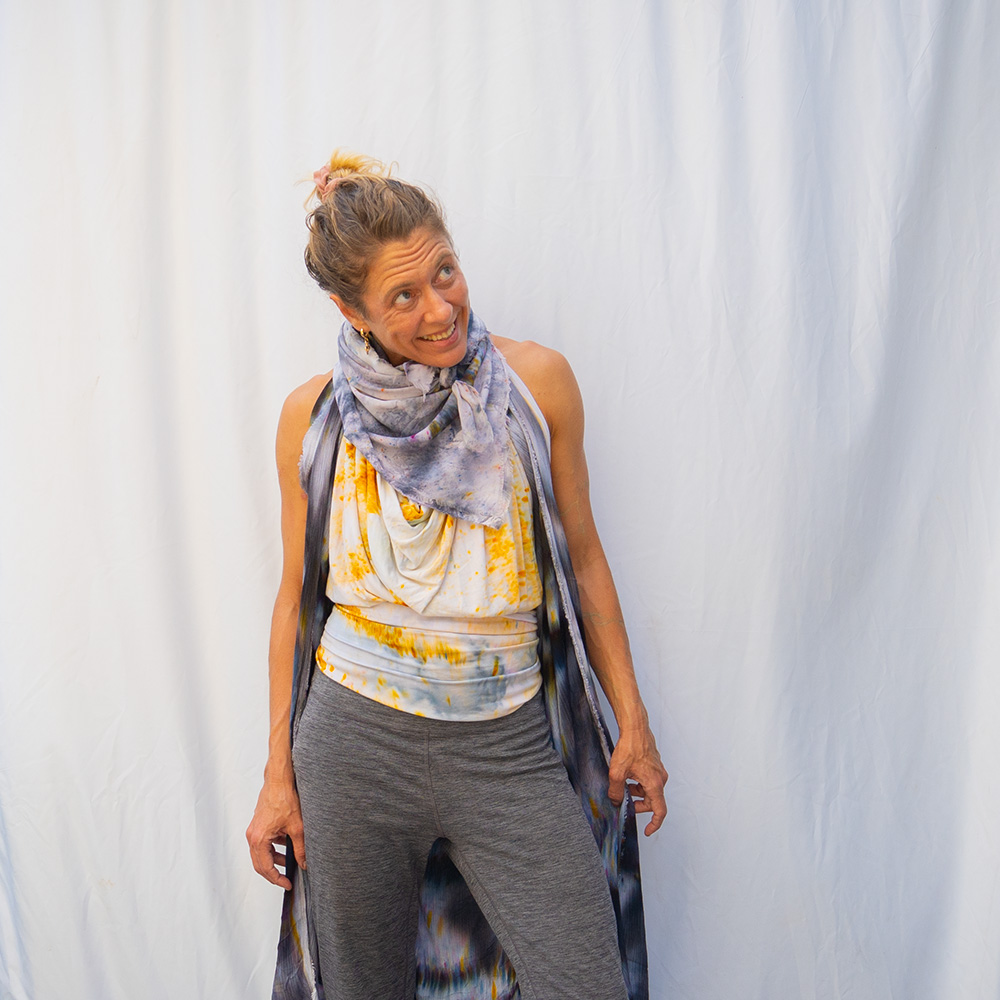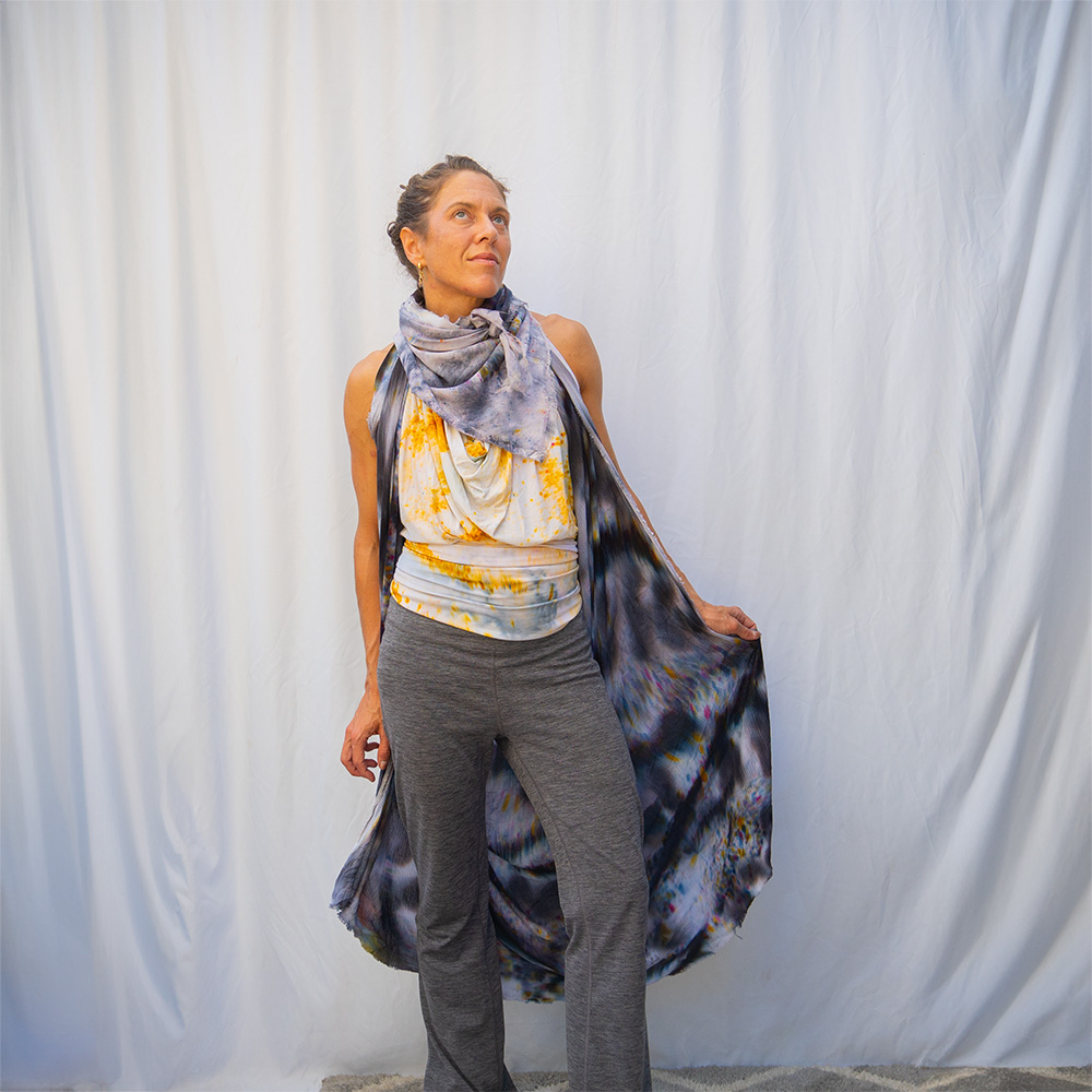 The Golden Gray Halter Scarf is a 40×40 inch square cut from ultra-soft Rayon + Spandex knit. The knit construction has gentle stretch and recovery, draping softly against the body and holding its shape through repeated styling. Each piece is hand dash-dyed using Dharma Procion MX fiber reactive dye — applied in small, intentional amounts so color bonds permanently to the fiber. The result is a luminous, slightly varied depth of tone unique to each piece. Care: machine wash cold, gentle cycle. Lay flat or hang to dry. Do not iron.