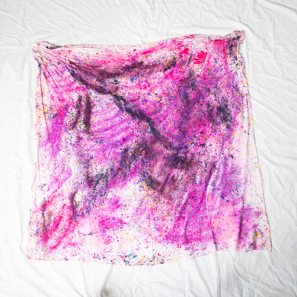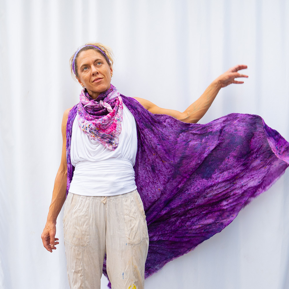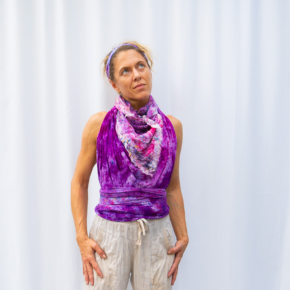 The Grape Wild Rag is a 36×36 inch square scarf cut from 100% Rayon. Rayon drapes with a fluid, silk-like weight that holds a knot beautifully and moves with you all day. Each piece is hand dash-dyed using Dharma Procion MX fiber reactive dye — a powder pigment mixed with a fixative and applied in small, intentional dashes so the color sets permanently into the fiber. No two pieces are identical. Care: machine wash cold, gentle cycle. Hang or lay flat to dry. Do not iron.