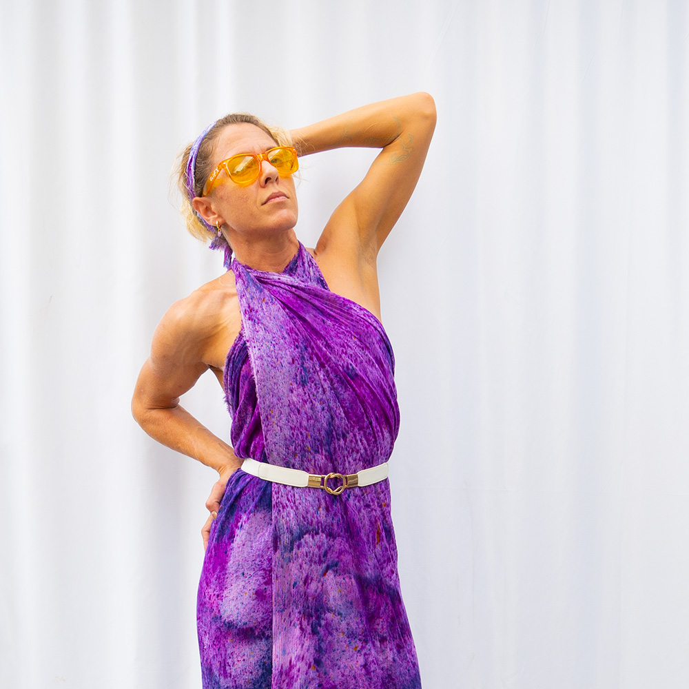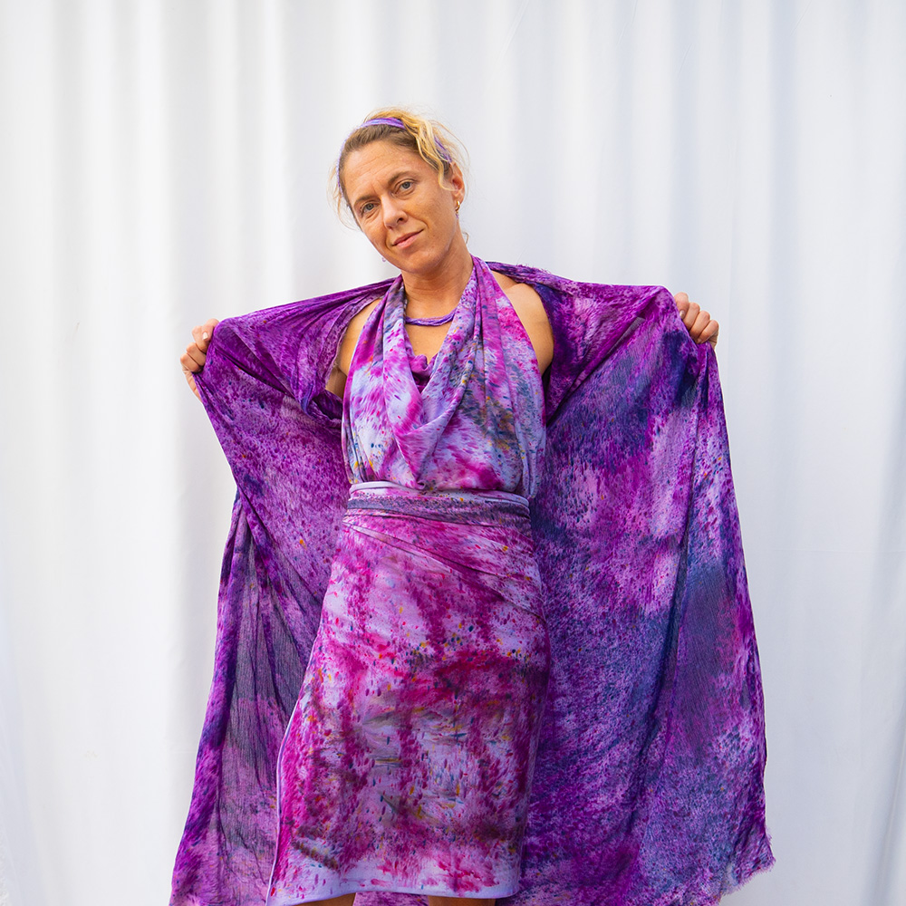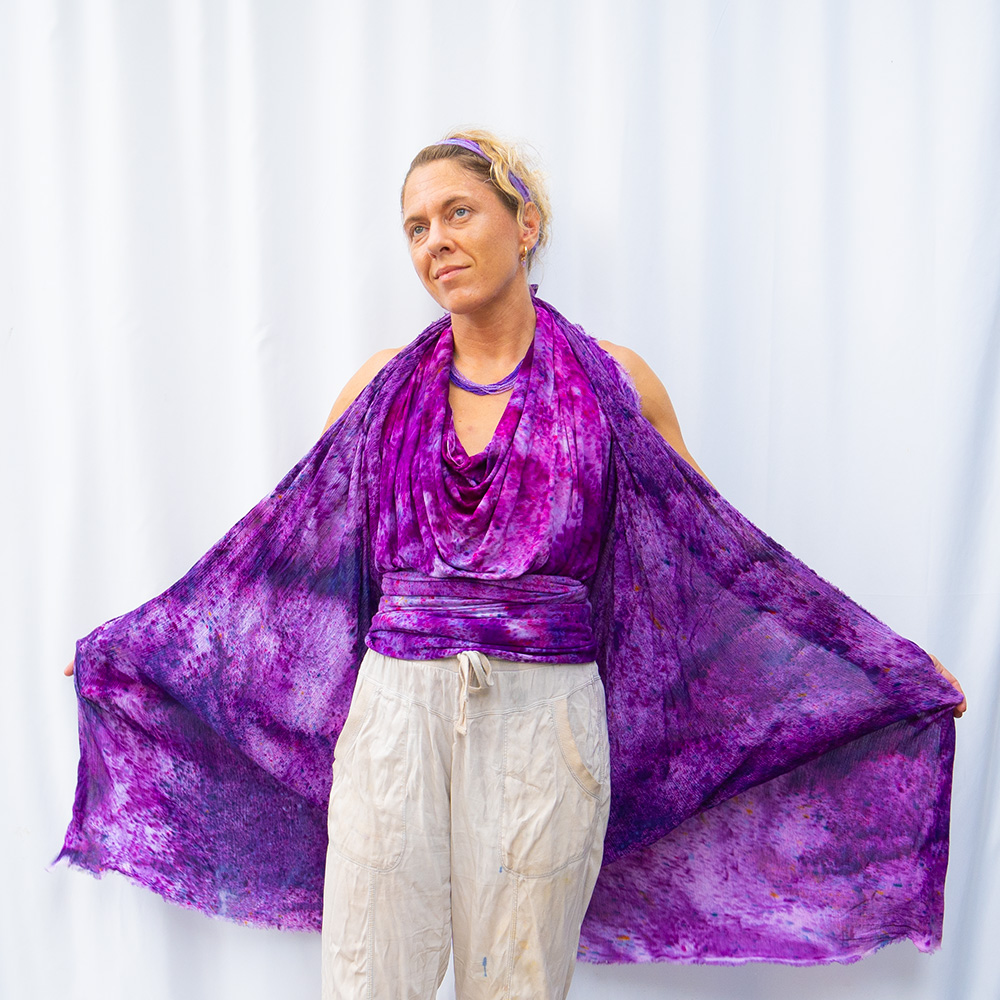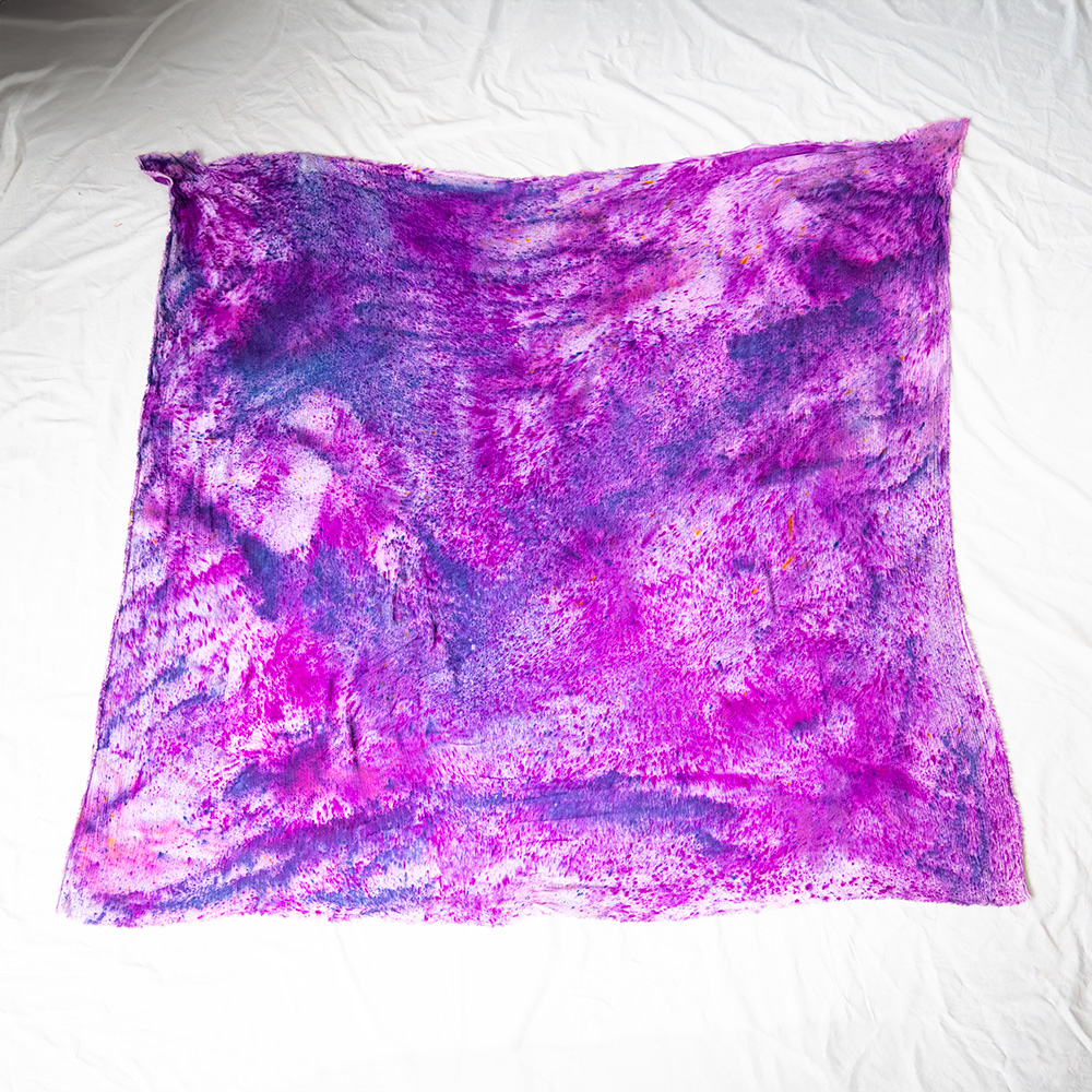 The Grape Square Wrap is a 50×50 inch square cut from 100% rayon. The generous size gives you full coverage as a wrap or shawl, and the lightweight rayon means it packs into nothing and emerges wrinkle-free. Each piece is hand dash-dyed using Dharma Procion MX fiber reactive dye — powder pigment fixed permanently into the fiber in small, deliberate dashes. The color is set, not coated, so it remains vivid through years of washing. Care: machine wash cold, regular cycle. Lay flat to dry. Do not iron.