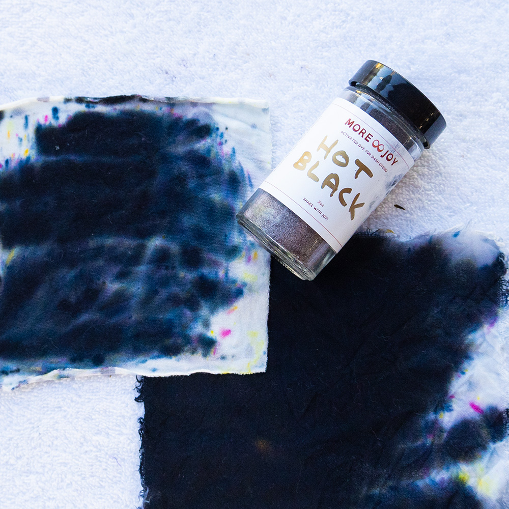 Hot Black is a deep, blue-navy black requiring hot water activation — rich and enveloping. Dharma Trading Co. #275 (hot water formula). The warmest of our three blacks, with a subtle blue-navy depth. Pairs with Deep Space and Nebula Navy for a deep cool-dark spectrum.