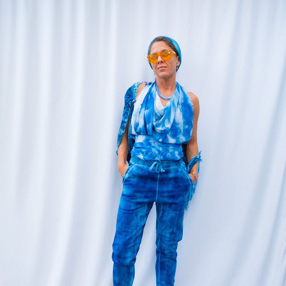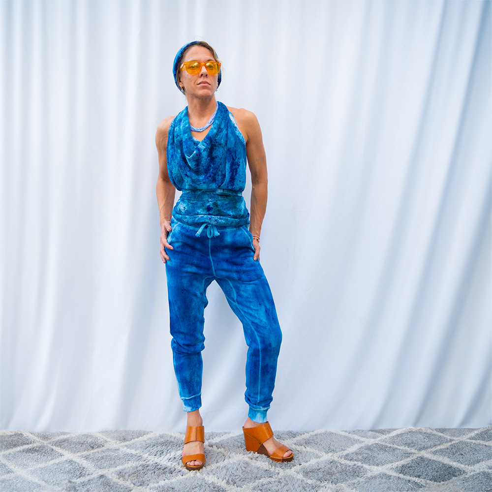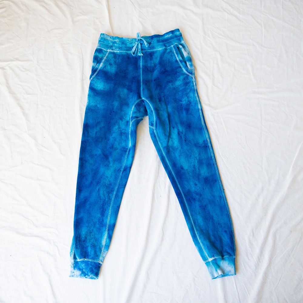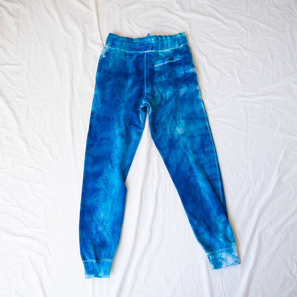 The Houdini Joggers are cut from heavy-weight fleece — 80% cotton, 20% polyester — with a flat elastic waistband, cuff-ribbed ankles, two front pockets, and one back pocket. The drop crotch and tapered leg give a relaxed fit through the hip with a clean line from the knee down. Each pair is hand dash-dyed using Dharma Procion MX fiber reactive dye — a powder pigment applied in small, intentional dashes and fixed permanently into the cotton fibers. Care: machine wash cold. Tumble dry low. Do not iron the dyed areas.