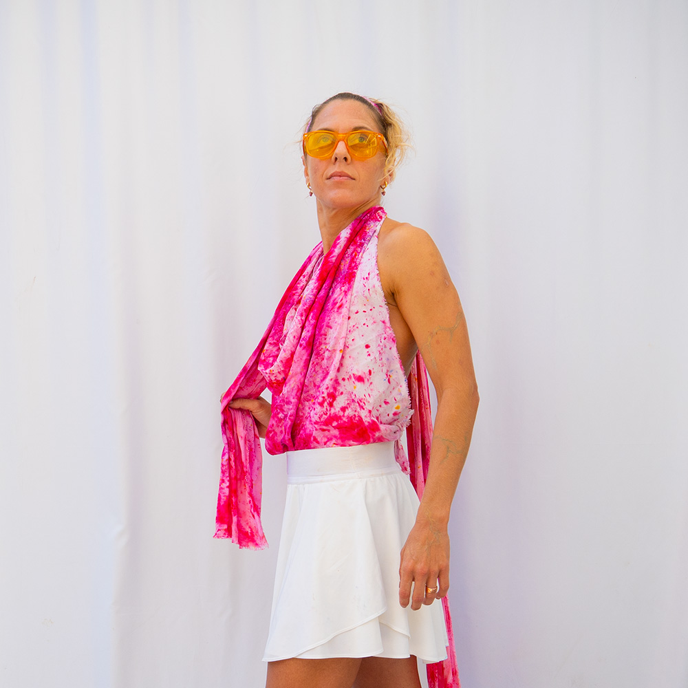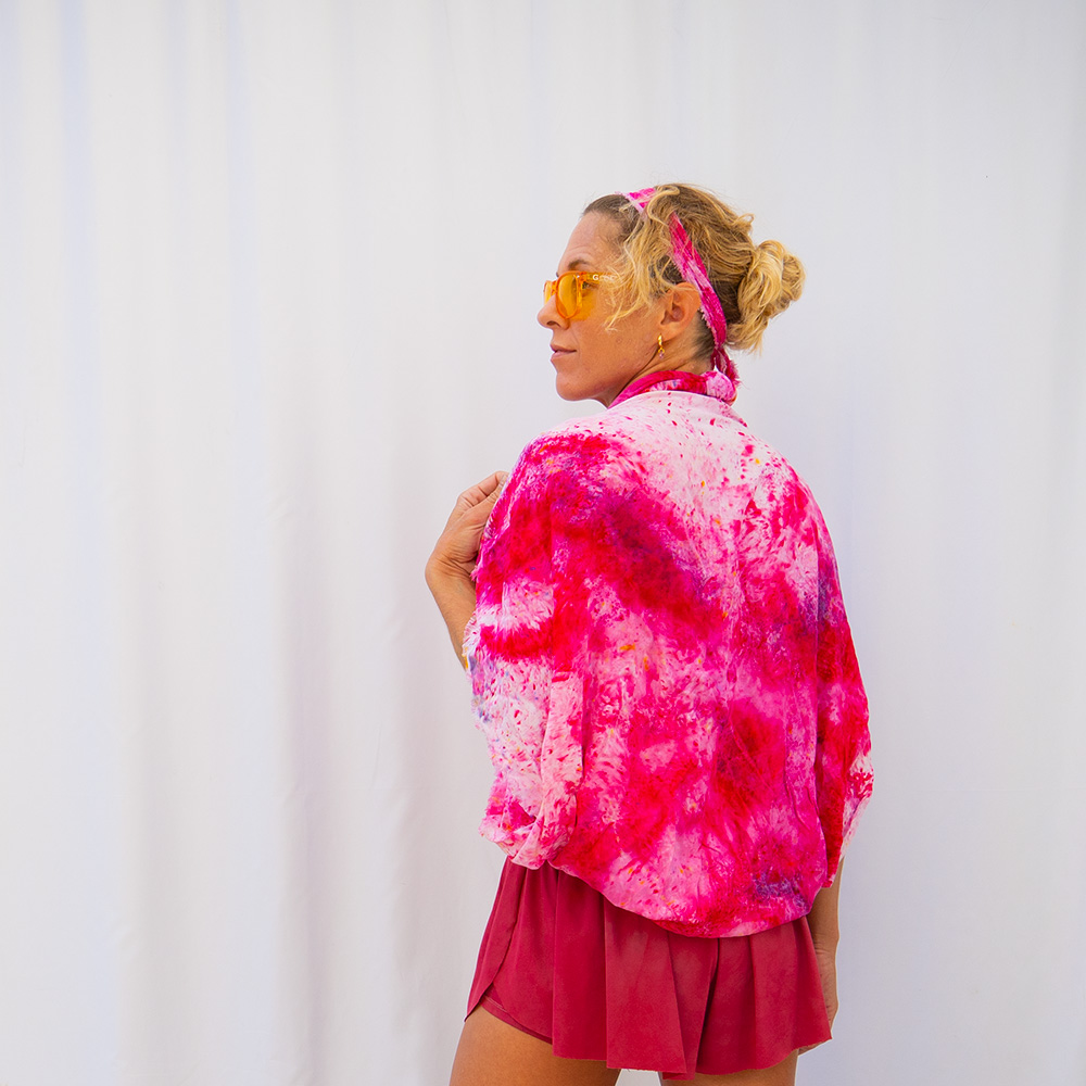 The Light Fuchsia Wild Rag is a 36×36 inch square scarf cut from 100% Rayon. Rayon drapes with a fluid, silk-like weight that holds a knot beautifully and moves with you all day. Each piece is hand dash-dyed using Dharma Procion MX fiber reactive dye — a powder pigment mixed with a fixative and applied in small, intentional dashes so the color sets permanently into the fiber. No two pieces are identical. Care: machine wash cold, gentle cycle. Hang or lay flat to dry. Do not iron.