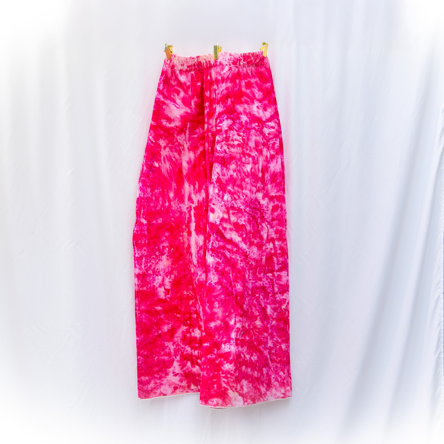 The Light Red Denim Pants are cut from stretch denim — 70% cotton, 28% polyester, 2% spandex — with a 32-inch waist (stretch fit) and 34-inch inseam. The elastic waistband sits flat and stays put, and the fabric has enough recovery to layer easily over leggings or yoga pants. Each pair is hand dash-dyed using Dharma Procion MX fiber reactive dye — applied in small, deliberate amounts so the pigment bonds permanently to the cotton fibers. The color is in the fiber, not on it, so it holds up through repeated washing without fading. Care: machine wash cold. Tumble dry low. Do not iron the dyed areas.