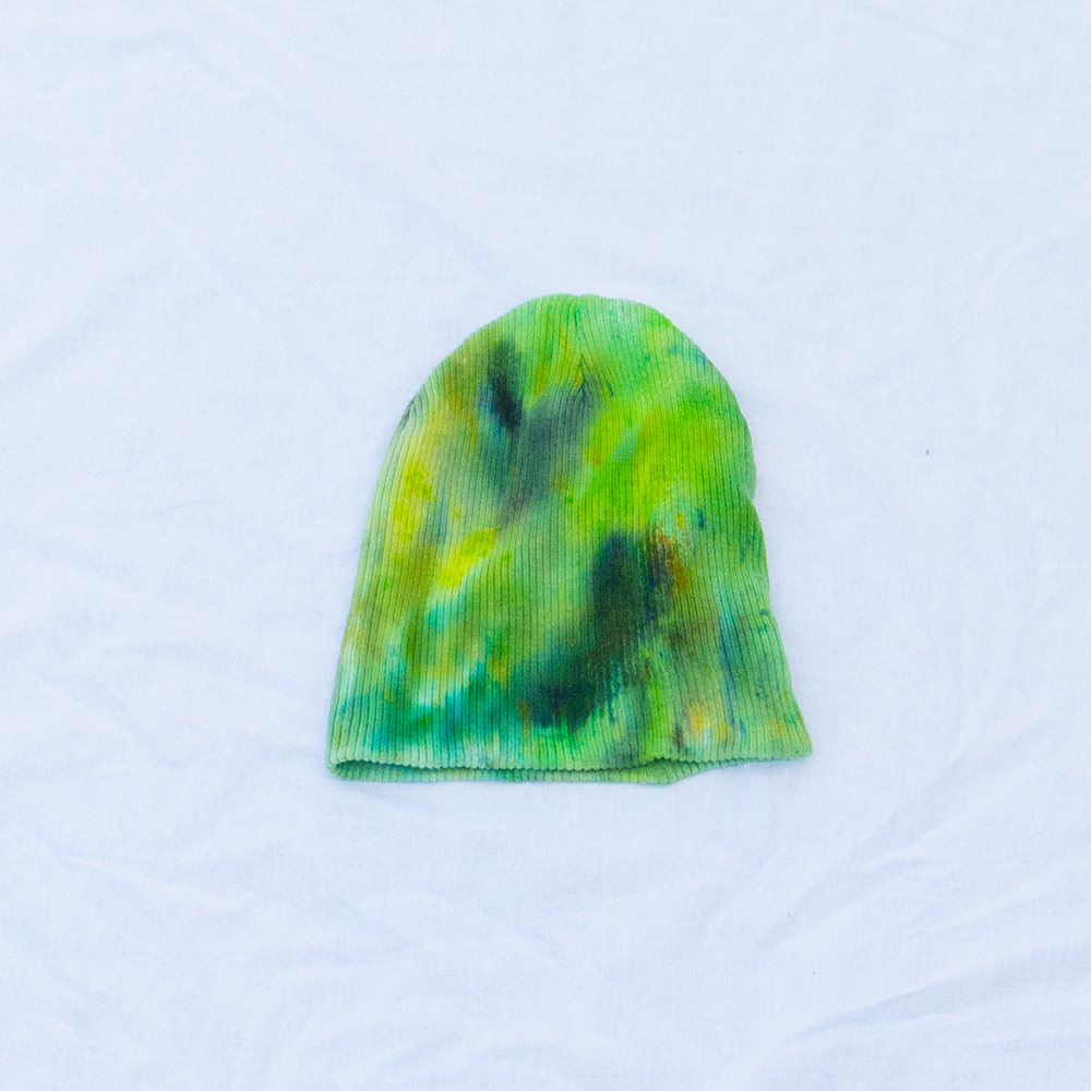 The Lime Green Beanie is knit from 100% cotton and measures approximately 7×10 inches when flat. The cotton construction breathes well and softens with washing, fitting most adult head sizes comfortably with a slight stretch. Each piece is hand dash-dyed using Dharma Procion MX fiber reactive dye — a powder pigment applied in small, intentional dashes and fixed permanently into the fiber. The color will not bleed or fade with normal washing. Care: machine wash cold, gentle cycle. Lay flat to dry.