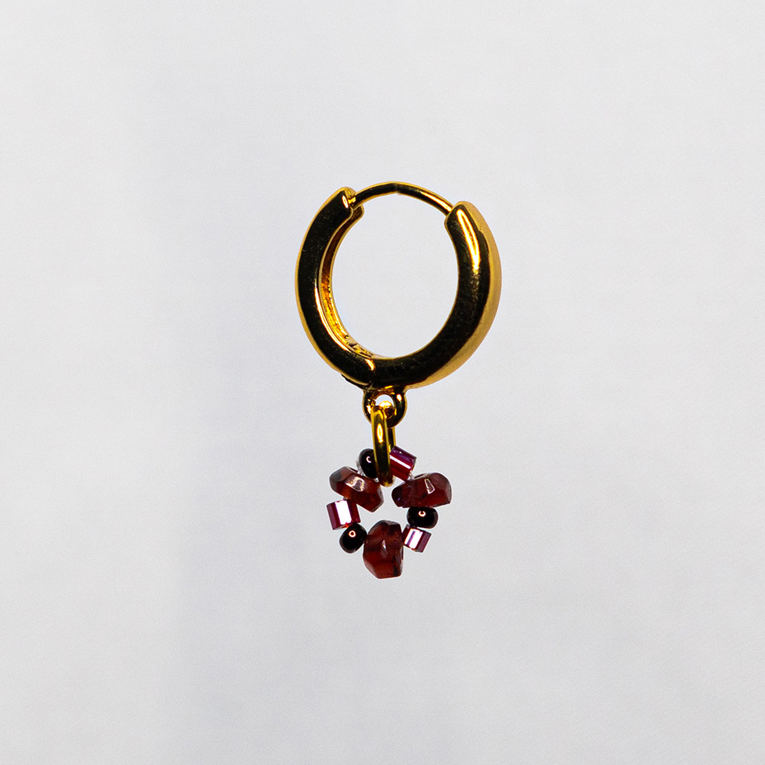 The Mahogany Garnet Earrings pair Garnet gemstones with Czech Preciosa Ornela beads on 18k gold huggie hoops — small enough to wear every day, interesting enough to earn a compliment.