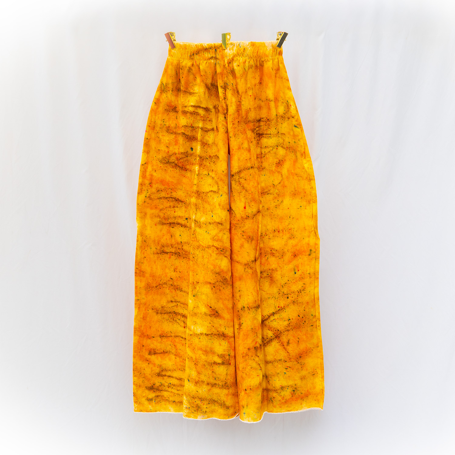 The Marigold Denim Pants are cut from stretch denim — 70% cotton, 28% polyester, 2% spandex — with a 32-inch waist (stretch fit) and 34-inch inseam. The elastic waistband sits flat and stays put, and the fabric has enough recovery to layer easily over leggings or yoga pants. Each pair is hand dash-dyed using Dharma Procion MX fiber reactive dye — applied in small, deliberate amounts so the pigment bonds permanently to the cotton fibers. The color is in the fiber, not on it, so it holds up through repeated washing without fading. Care: machine wash cold. Tumble dry low. Do not iron the dyed areas.