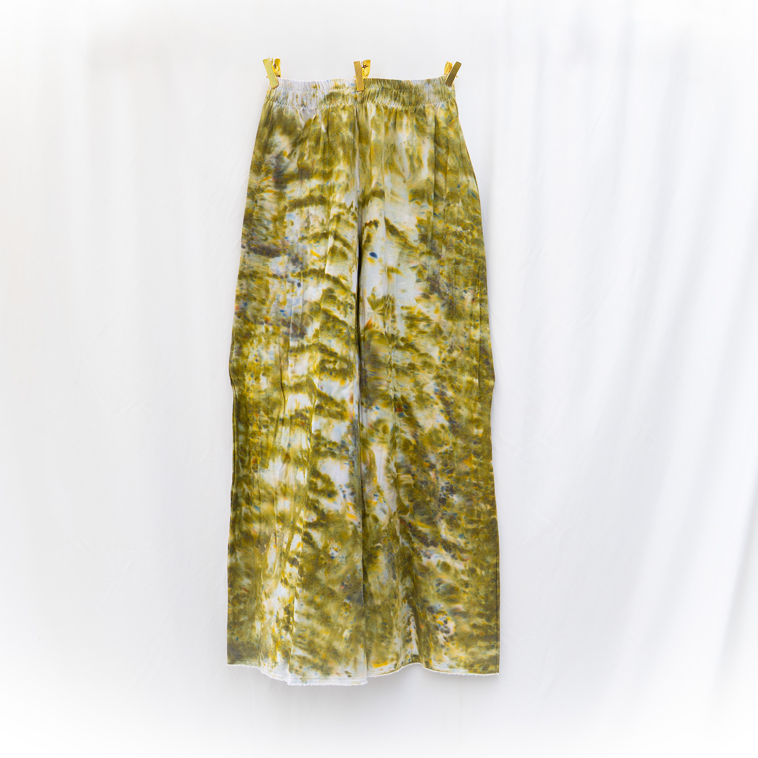 The Moss Denim Pants are cut from stretch denim — 70% cotton, 28% polyester, 2% spandex — with a 32-inch waist (stretch fit) and 34-inch inseam. The elastic waistband sits flat and stays put, and the fabric has enough recovery to layer easily over leggings or yoga pants. Each pair is hand dash-dyed using Dharma Procion MX fiber reactive dye — applied in small, deliberate amounts so the pigment bonds permanently to the cotton fibers. The color is in the fiber, not on it, so it holds up through repeated washing without fading. Care: machine wash cold. Tumble dry low. Do not iron the dyed areas.