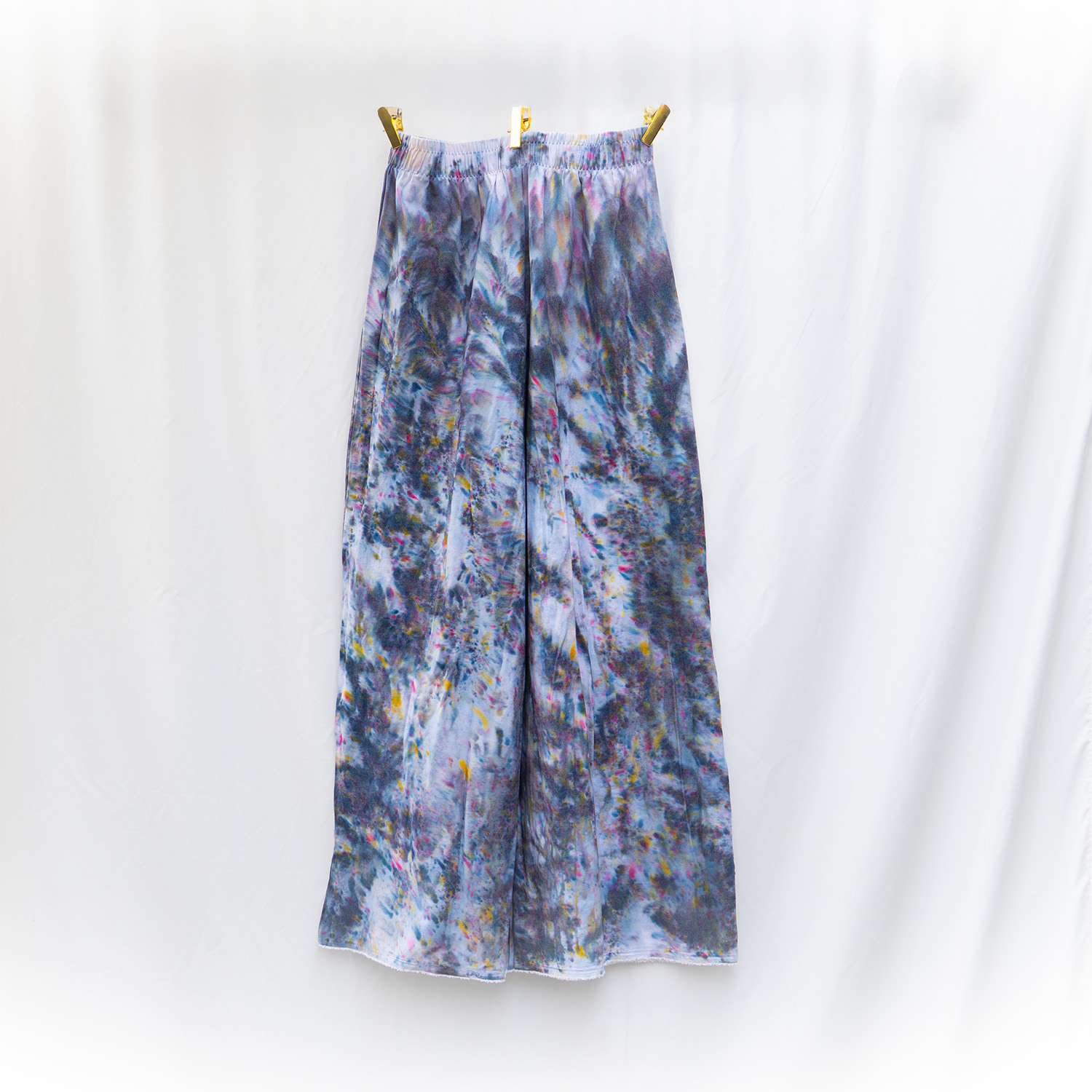 The New Black Denim Pants are cut from stretch denim — 70% cotton, 28% polyester, 2% spandex — with a 32-inch waist (stretch fit) and 34-inch inseam. The elastic waistband sits flat and stays put, and the fabric has enough recovery to layer easily over leggings or yoga pants. Each pair is hand dash-dyed using Dharma Procion MX fiber reactive dye — applied in small, deliberate amounts so the pigment bonds permanently to the cotton fibers. The color is in the fiber, not on it, so it holds up through repeated washing without fading. Care: machine wash cold. Tumble dry low. Do not iron the dyed areas.