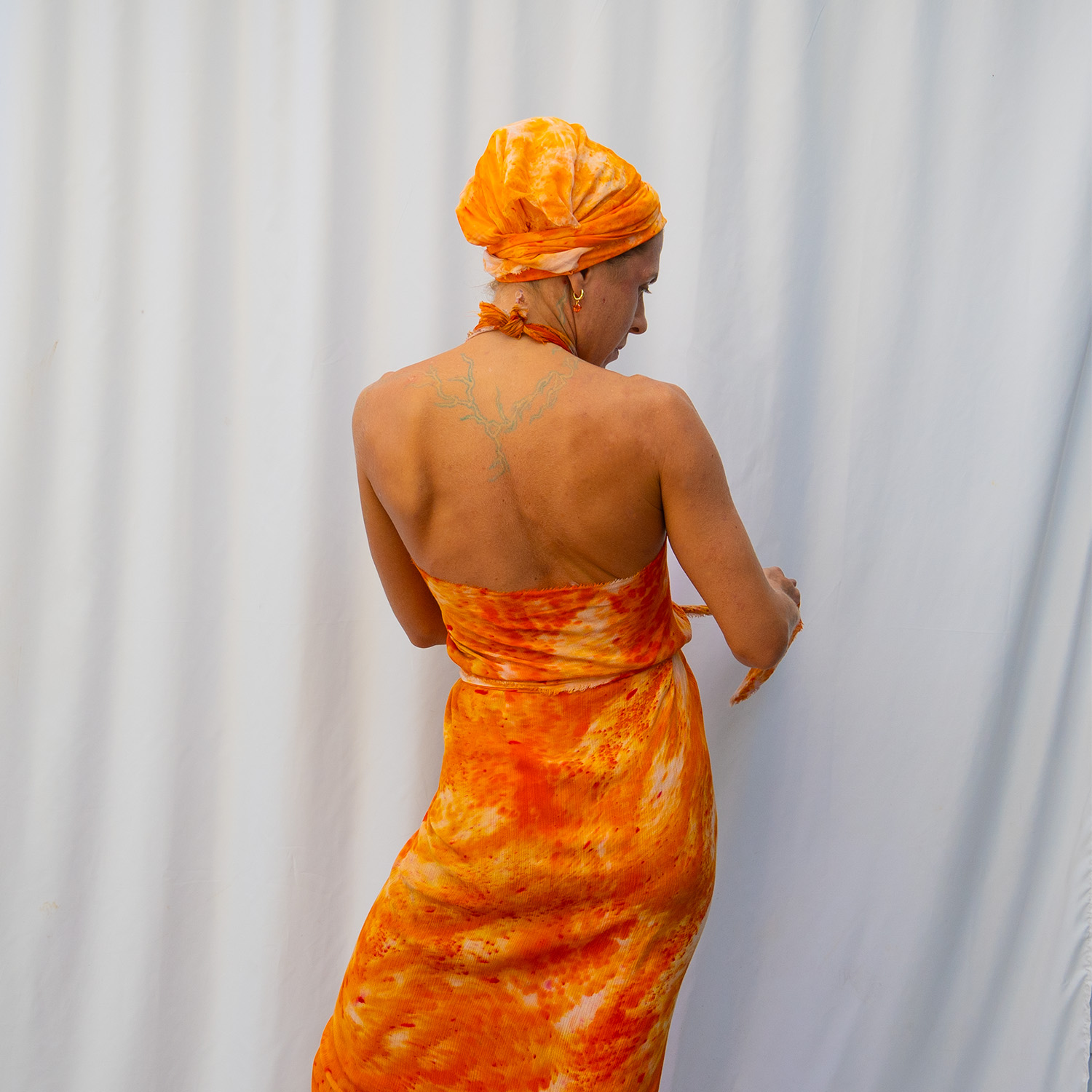 The Orange Crush Square Wrap is a 50×50 inch square cut from 100% rayon. The generous size gives you full coverage as a wrap or shawl, and the lightweight rayon means it packs into nothing and emerges wrinkle-free. Each piece is hand dash-dyed using Dharma Procion MX fiber reactive dye — powder pigment fixed permanently into the fiber in small, deliberate dashes. The color is set, not coated, so it remains vivid through years of washing. Care: machine wash cold, regular cycle. Lay flat to dry. Do not iron.