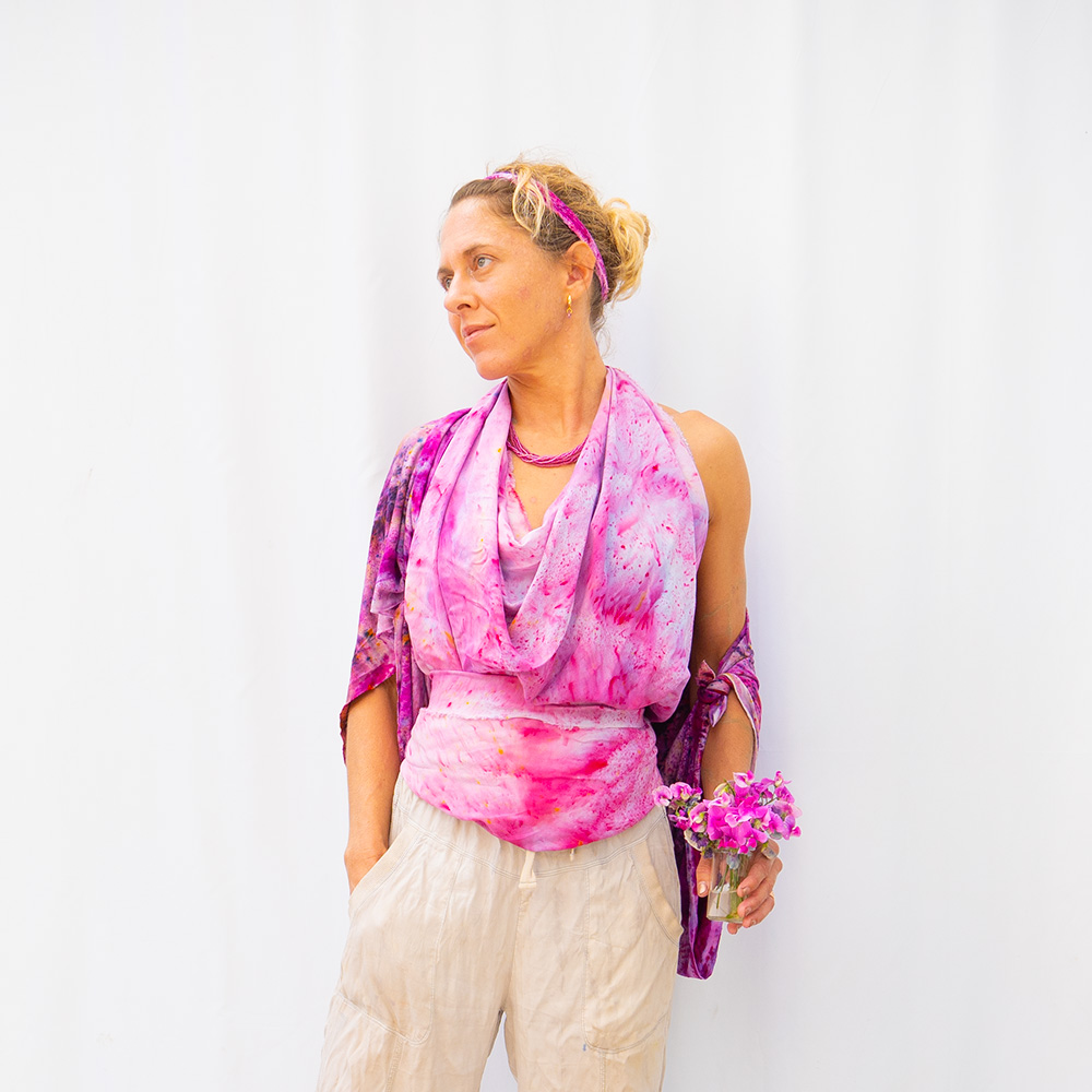 The Orchid Wild Rag is a 36×36 inch square scarf cut from 100% Rayon. Rayon drapes with a fluid, silk-like weight that holds a knot beautifully and moves with you all day. Each piece is hand dash-dyed using Dharma Procion MX fiber reactive dye — a powder pigment mixed with a fixative and applied in small, intentional dashes so the color sets permanently into the fiber. No two pieces are identical. Care: machine wash cold, gentle cycle. Hang or lay flat to dry. Do not iron.