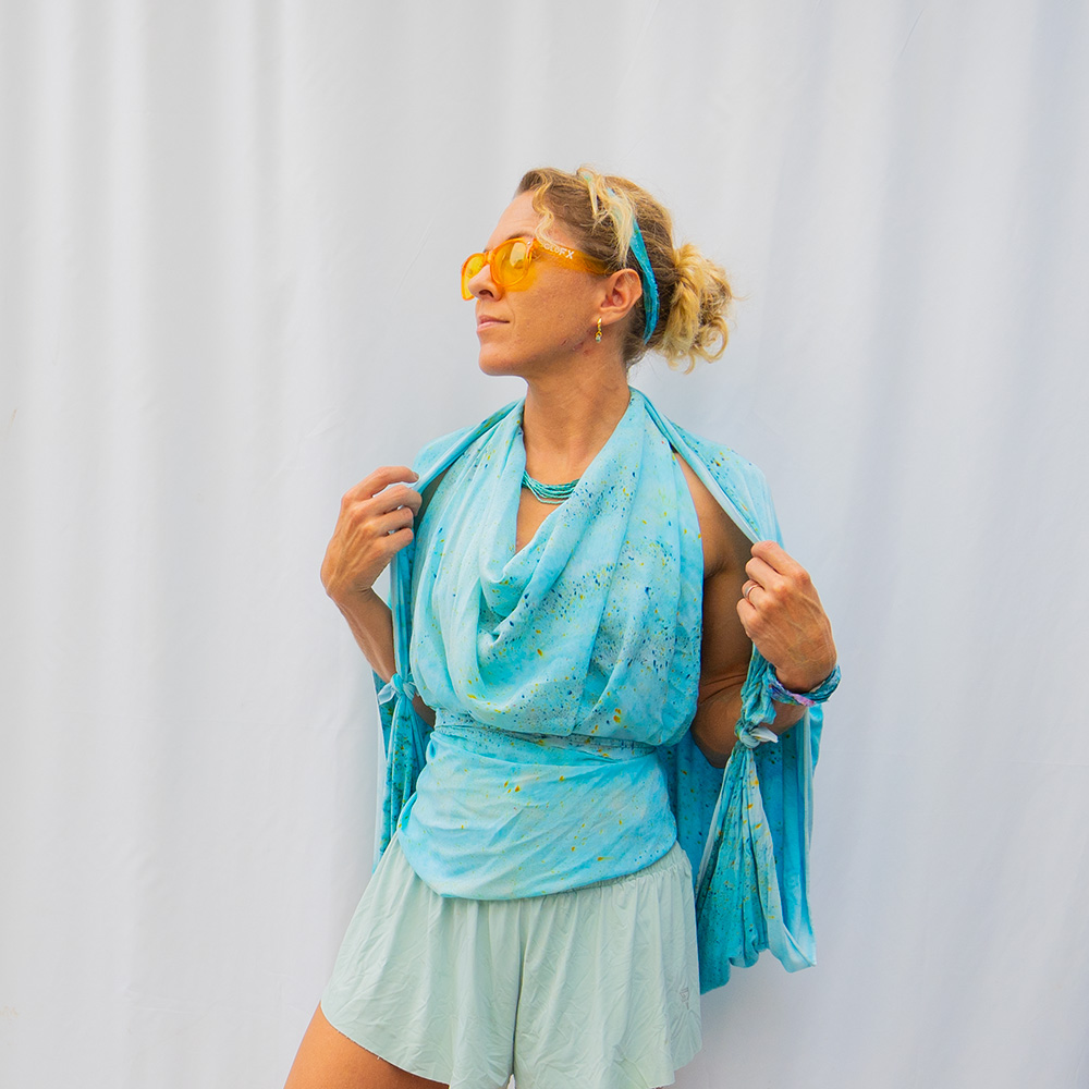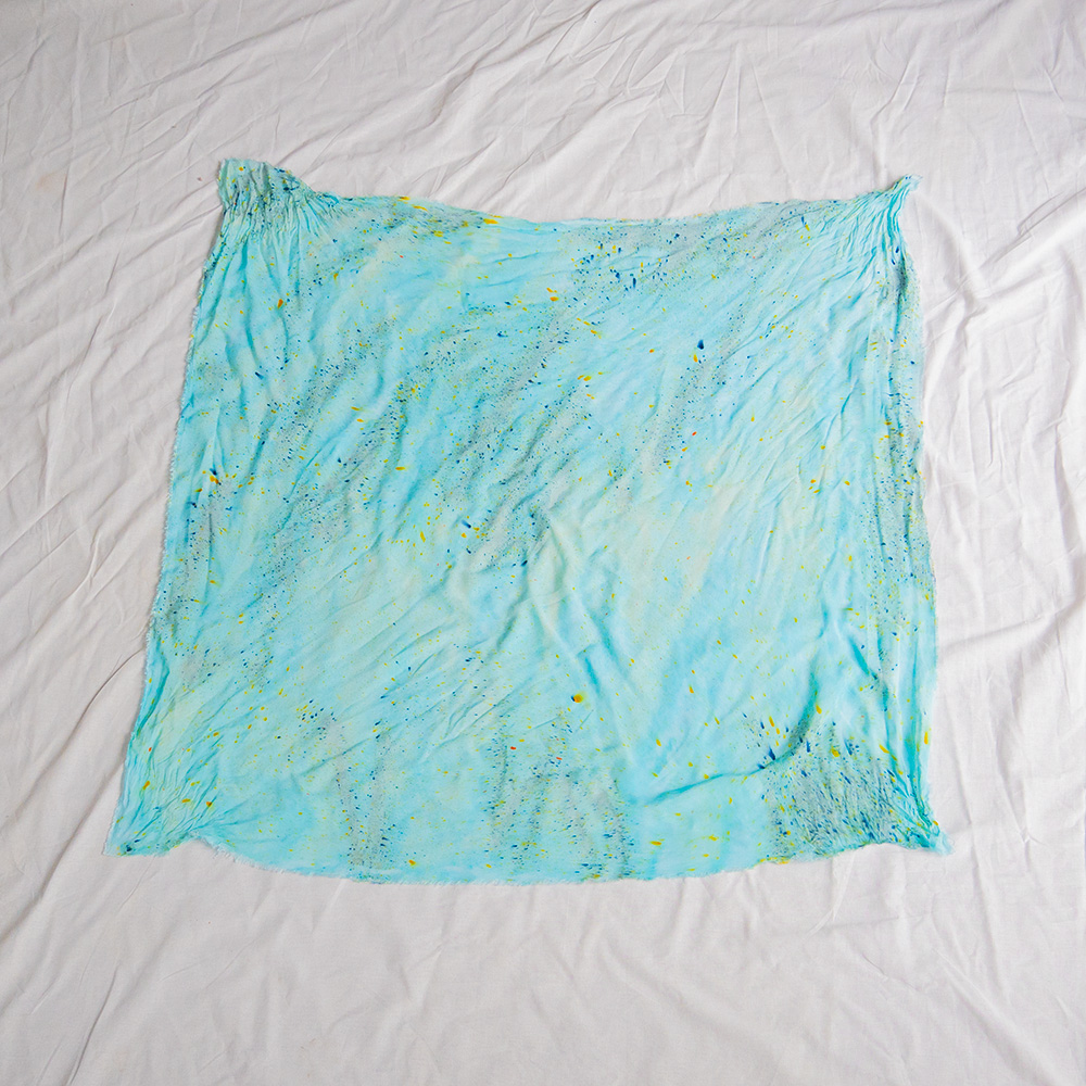The Parakeet Wild Rag is a 36×36 inch square scarf cut from 100% Rayon. Rayon drapes with a fluid, silk-like weight that holds a knot beautifully and moves with you all day. Each piece is hand dash-dyed using Dharma Procion MX fiber reactive dye — a powder pigment mixed with a fixative and applied in small, intentional dashes so the color sets permanently into the fiber. No two pieces are identical. Care: machine wash cold, gentle cycle. Hang or lay flat to dry. Do not iron.